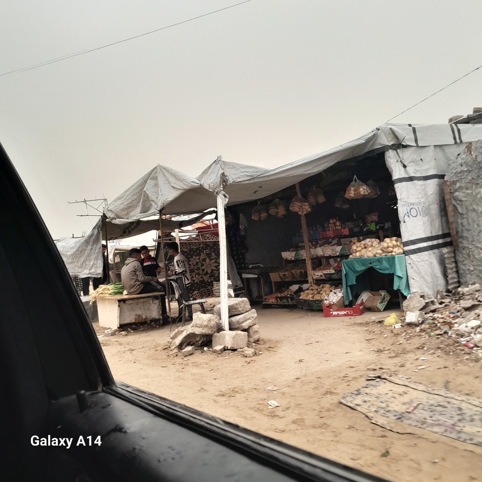 The image depicts a makeshift roadside market in Khan Yunis, Palestinian Territory. The market structure is constructed from rough-hewn lumber and covered with gray tarpaulins. The interior is stockedβ¦read more