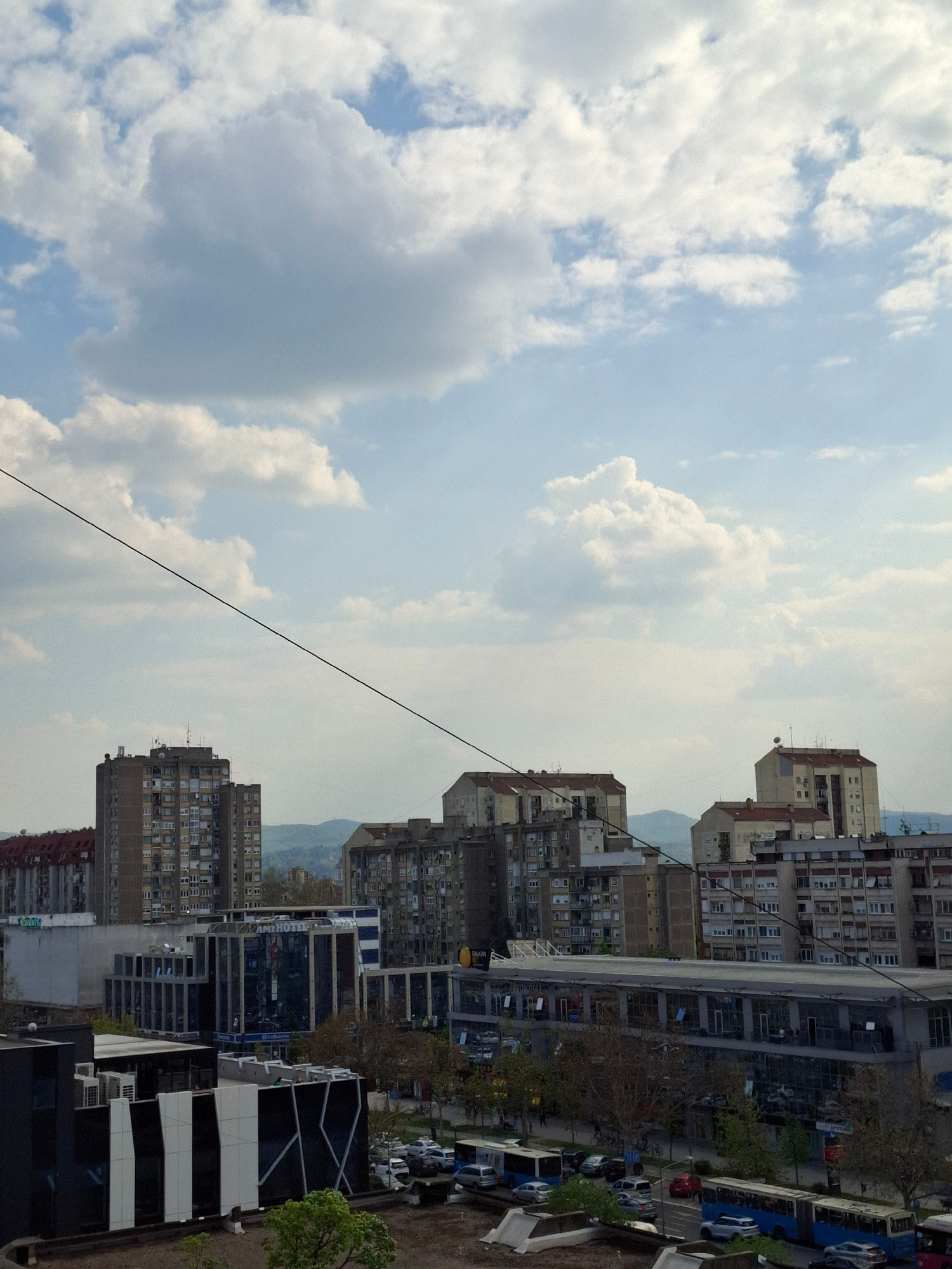 This image depicts an urban landscape in Novi Sad, Serbia, viewed during daytime under a partially cloudy sky. The perspective is from an elevated position, looking across a dense area of buildings an…read more