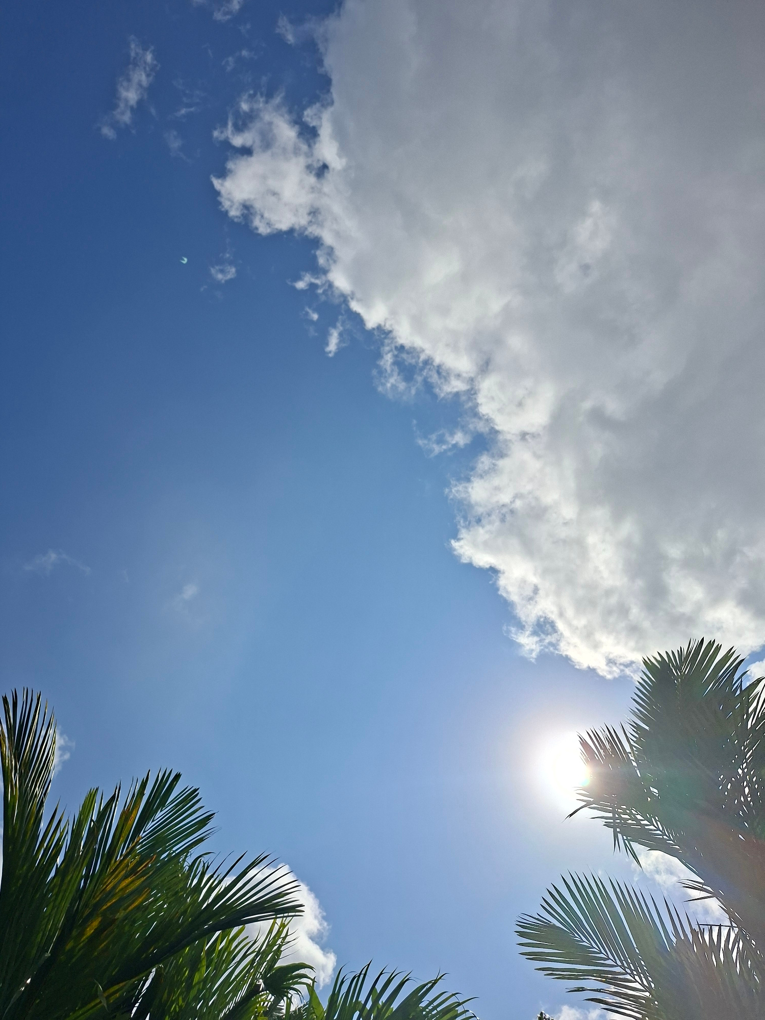 The image shows a view looking up at the sky. White clouds are on the left side of the frame. The sun is visible in the upper right corner, partially obscured by the fronds of a palm tree. The fronds…read more
