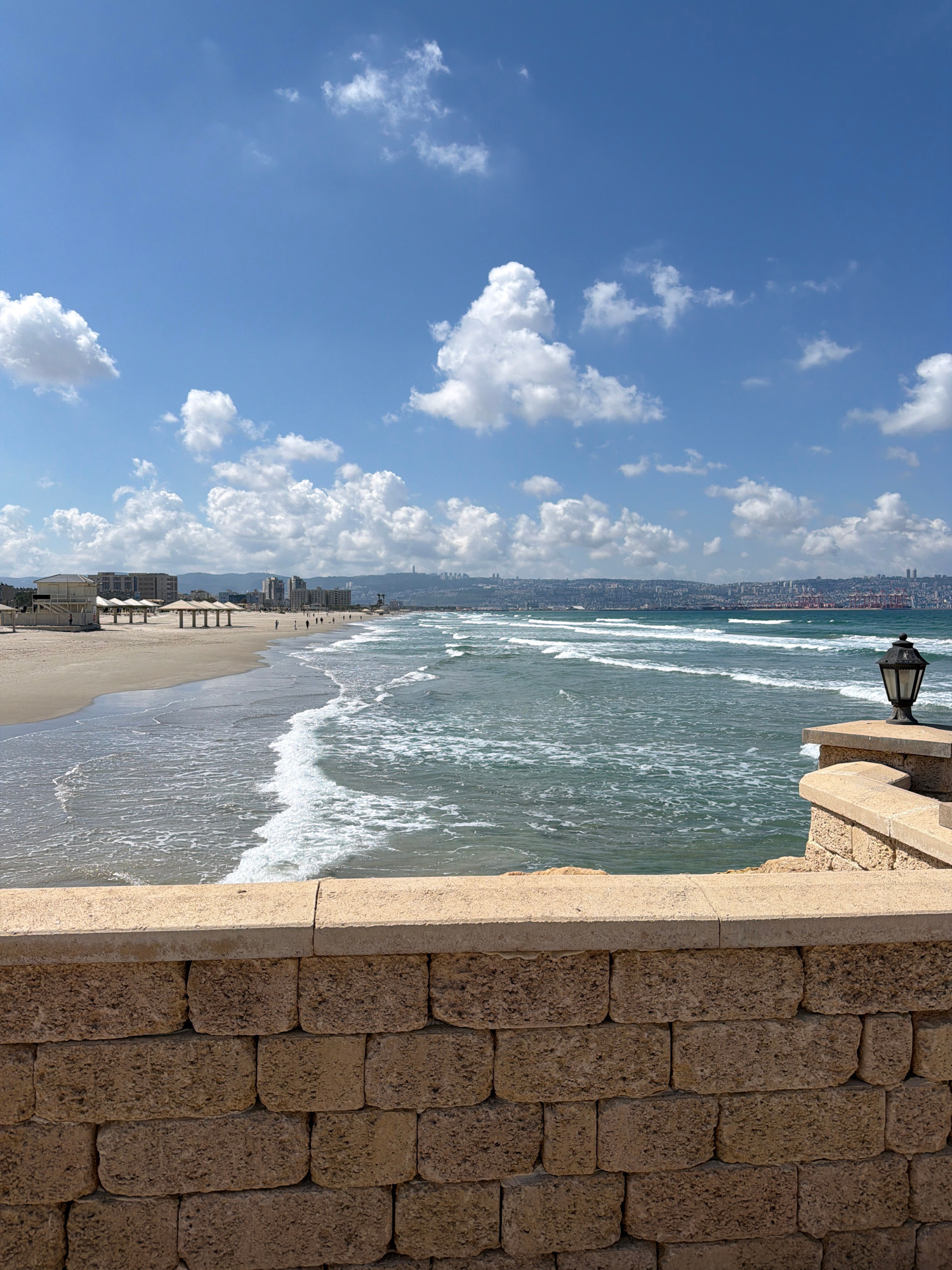 The image depicts a coastal scene in Kiryat Yam, Israel. A stone wall occupies the right side of the frame, suggesting a higher vantage point overlooking the beach and sea. To the left of the wall is…read more