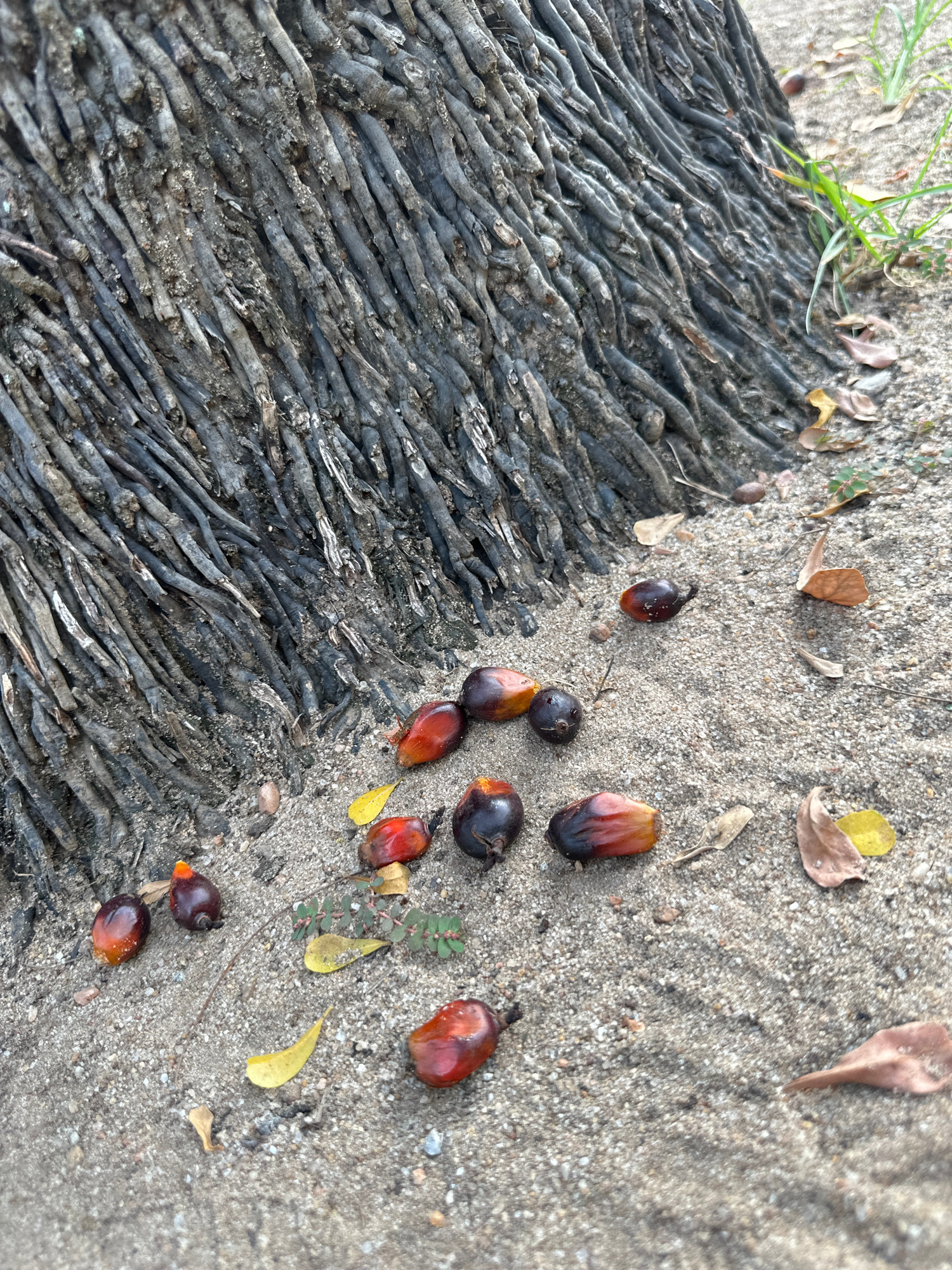 The image shows a section of ground in Lagos, Nigeria. A dense mat of aerial roots from a palm tree is visible to the left. To the right, the sandy ground is littered with fallen palm fruits in varyin…read more