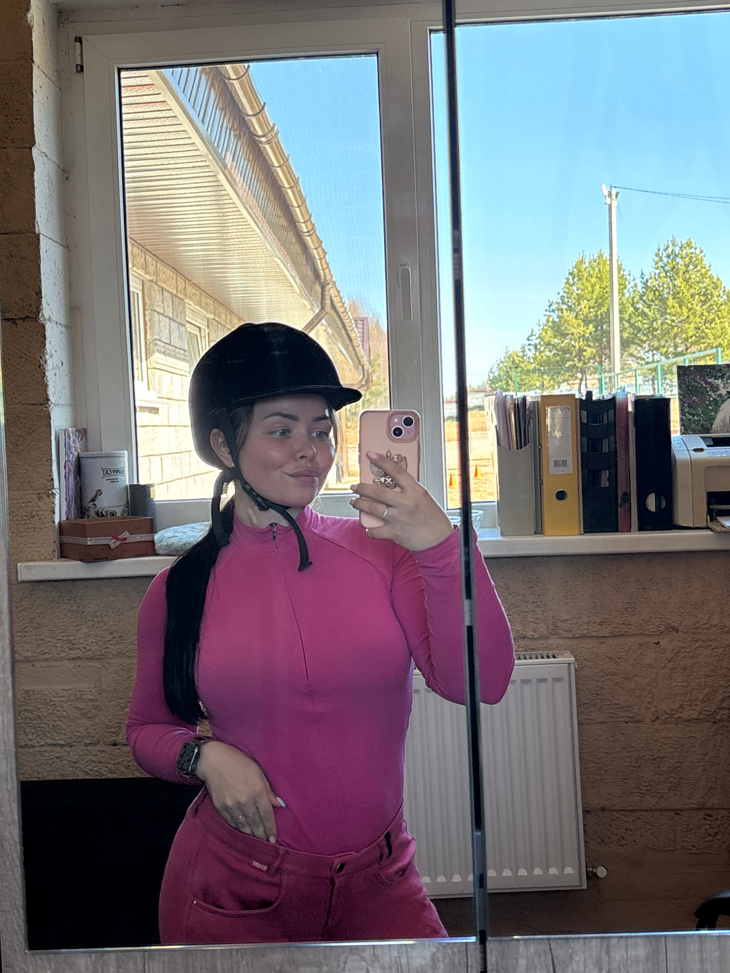 A young woman takes a mirror selfie indoors in Русский Вожой, Russia, during what appears to be a bright, sunny day. She is wearing a bright pink long-sleeved top or sweatshirt and matching pink pants…read more
