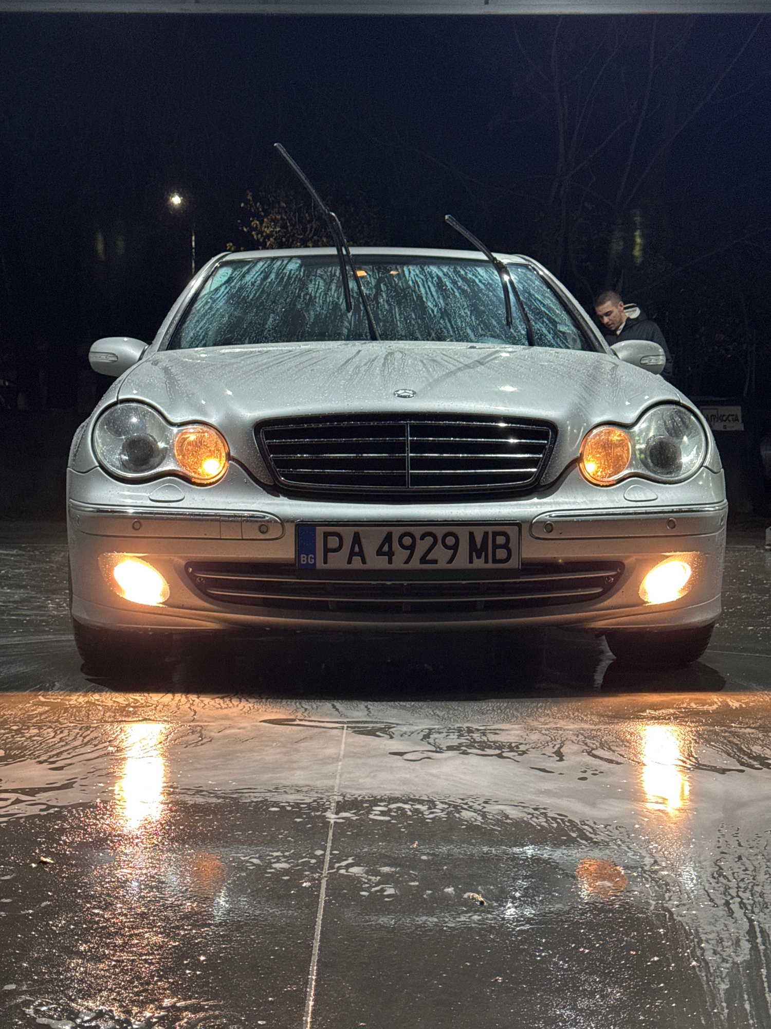 The image shows a silver Mercedes-Benz car at a car wash location. The car's license plate reads "PA 4929 MB" and includes "BG" indicating Bulgaria. The car is covered in soap suds, particularly on th…read more