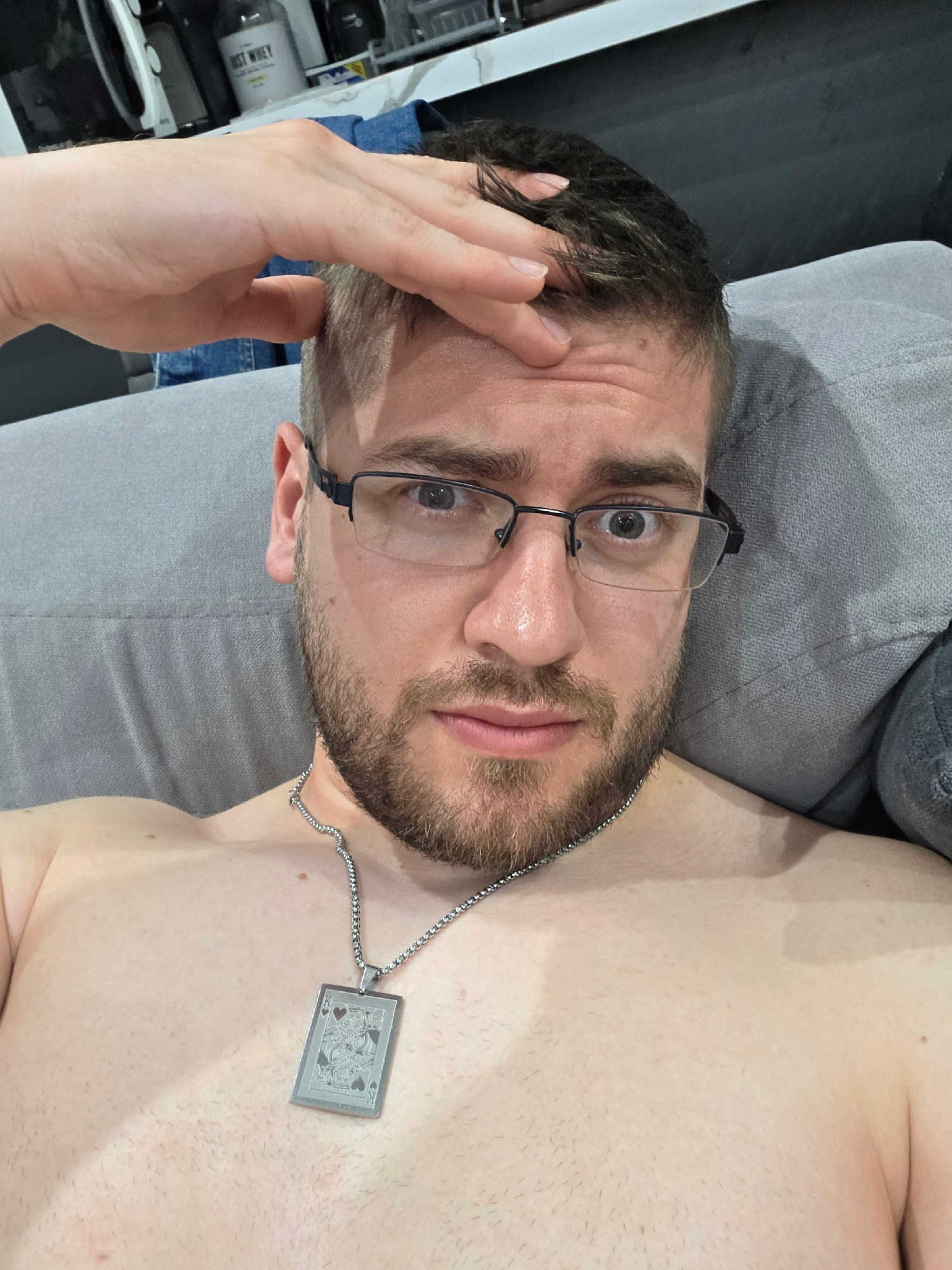 A man with a beard and glasses is lying on a gray couch. He is shirtless and wearing a silver necklace with a card pendant. His right hand is touching his head. The background includes a white kitchen…read more