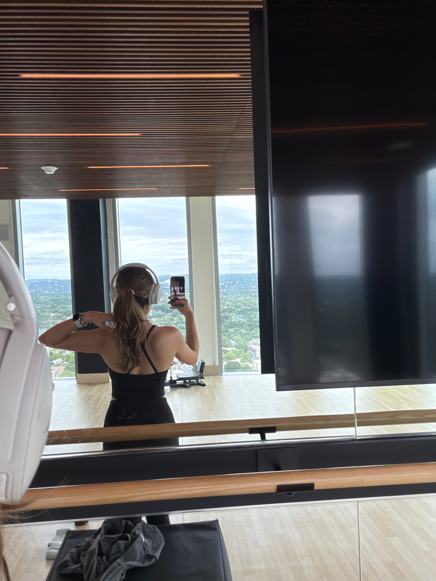 A woman with headphones is standing in front of a tall window, taking a selfie with her cell phone. She is wearing a black workout outfit and has long brown hair in a ponytail. The large window offers…read more