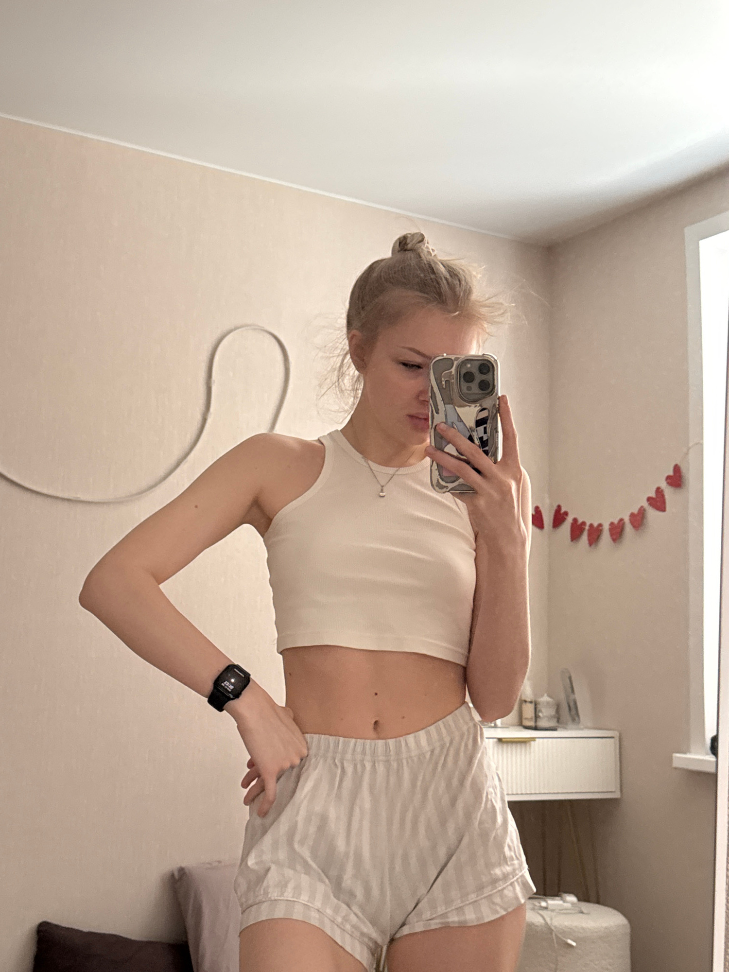A young woman is taking a selfie in what appears to be a bedroom or apartment. She is wearing a white crop top and striped shorts, and has a black smartwatch on her left wrist. Her hair is styled in a…read more