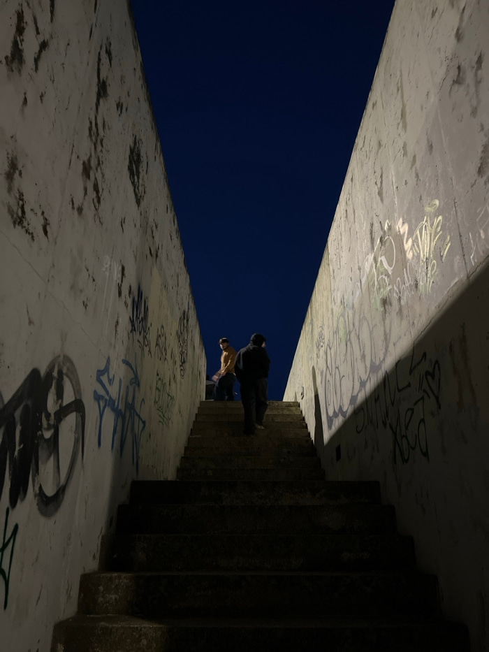 The image depicts a concrete pedestrian staircase at night in Bragança, Portugal. The perspective is from the bottom of the stairs, looking upward towards the street level. Two individuals are positio…read more