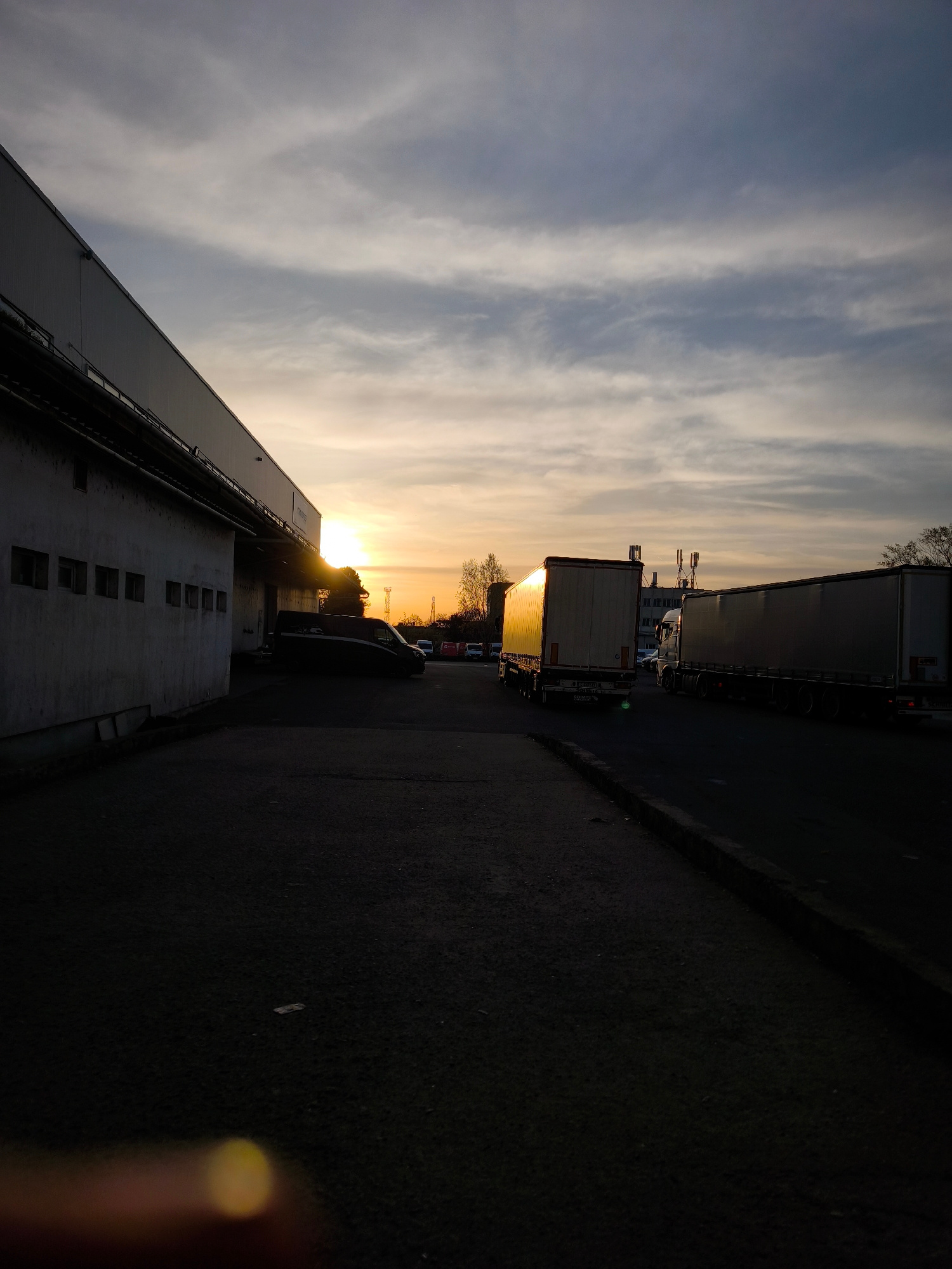 The image depicts an industrial scene at sunset in what appears to be a loading or parking area, with long-haul trucks parked alongside a building. The building is long, low, and possibly a warehouse…read more