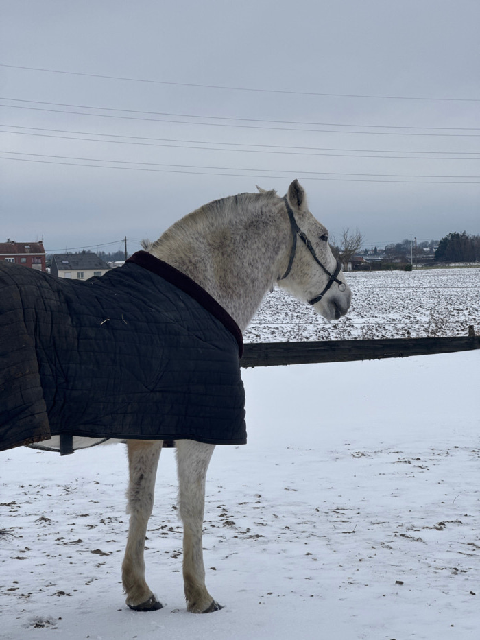 A light grey, dappled horse stands in a snow-covered field in Estaimpuis, Belgium. The horse is oriented towards the right of the frame, wearing a dark, possibly navy or black, quilted horse blanket w…read more