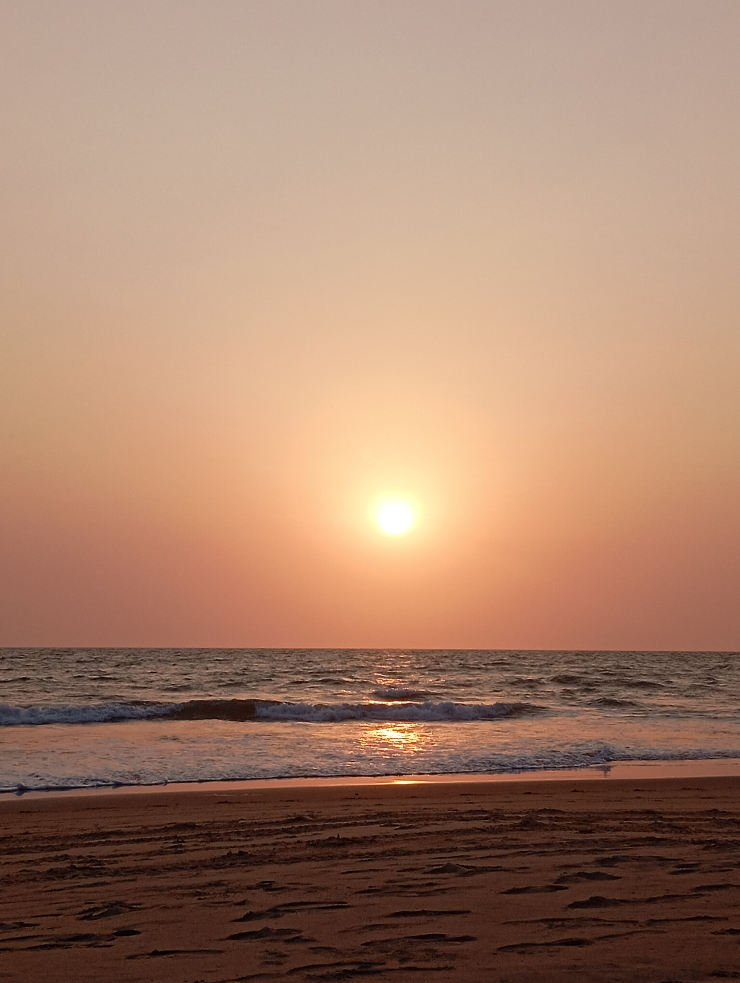 A serene vertical photograph captures a sunset over the Arabian Sea at Arambol, India. The upper two-thirds of the image are dominated by a clear, gradient sky, transitioning from a light, pale orange…read more