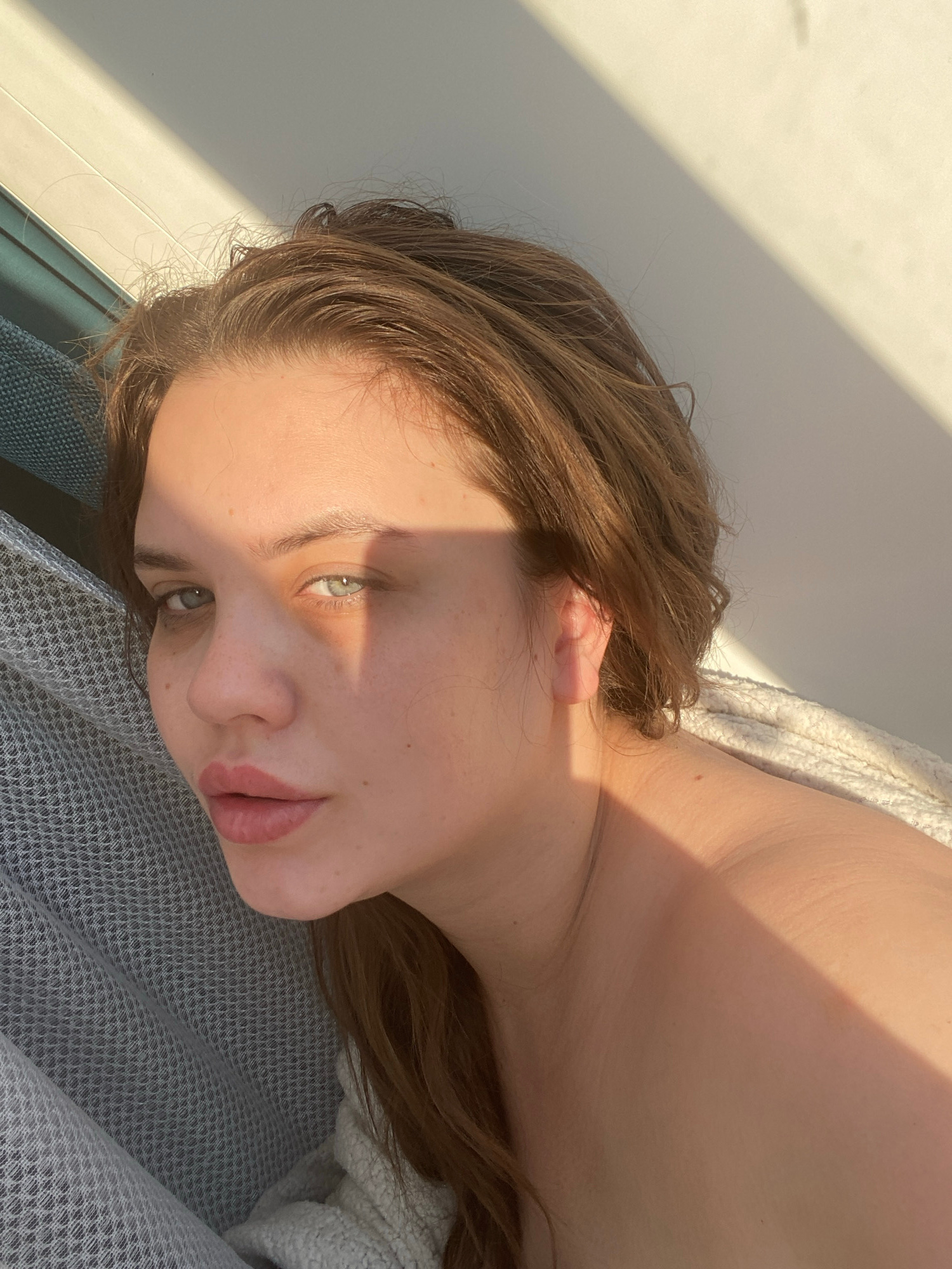 A woman with light brown hair and light eyes is lying down on a gray patterned surface. The photograph is taken at an angle, with her head tilted towards the bottom right corner. Part of her upper tor…read more