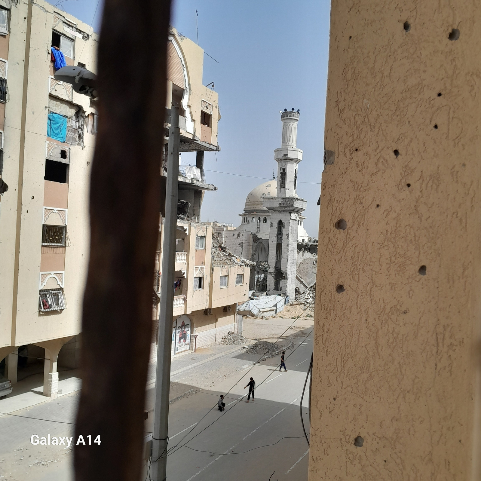 The image shows a scene in Khan Yunis, Palestinian Territory, with damaged buildings, including a mosque with a tall minaret. The buildings show signs of significant structural damage. Three individua…read more