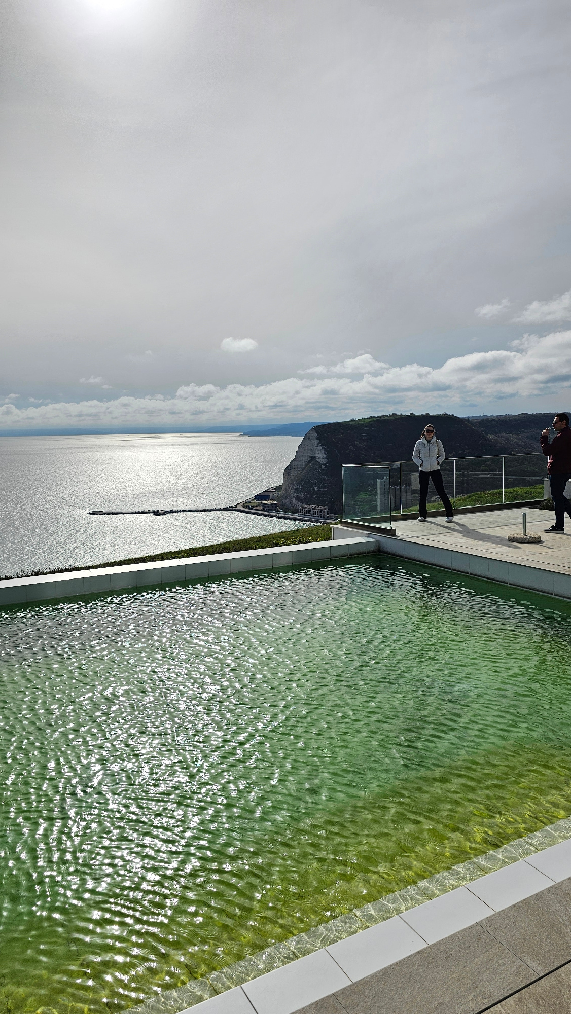 The image shows an outdoor scene with a water feature in the foreground. The water has a greenish hue and is rippled, reflecting sunlight. Adjacent to the water feature is a tiled area with a low glasβ¦read more
