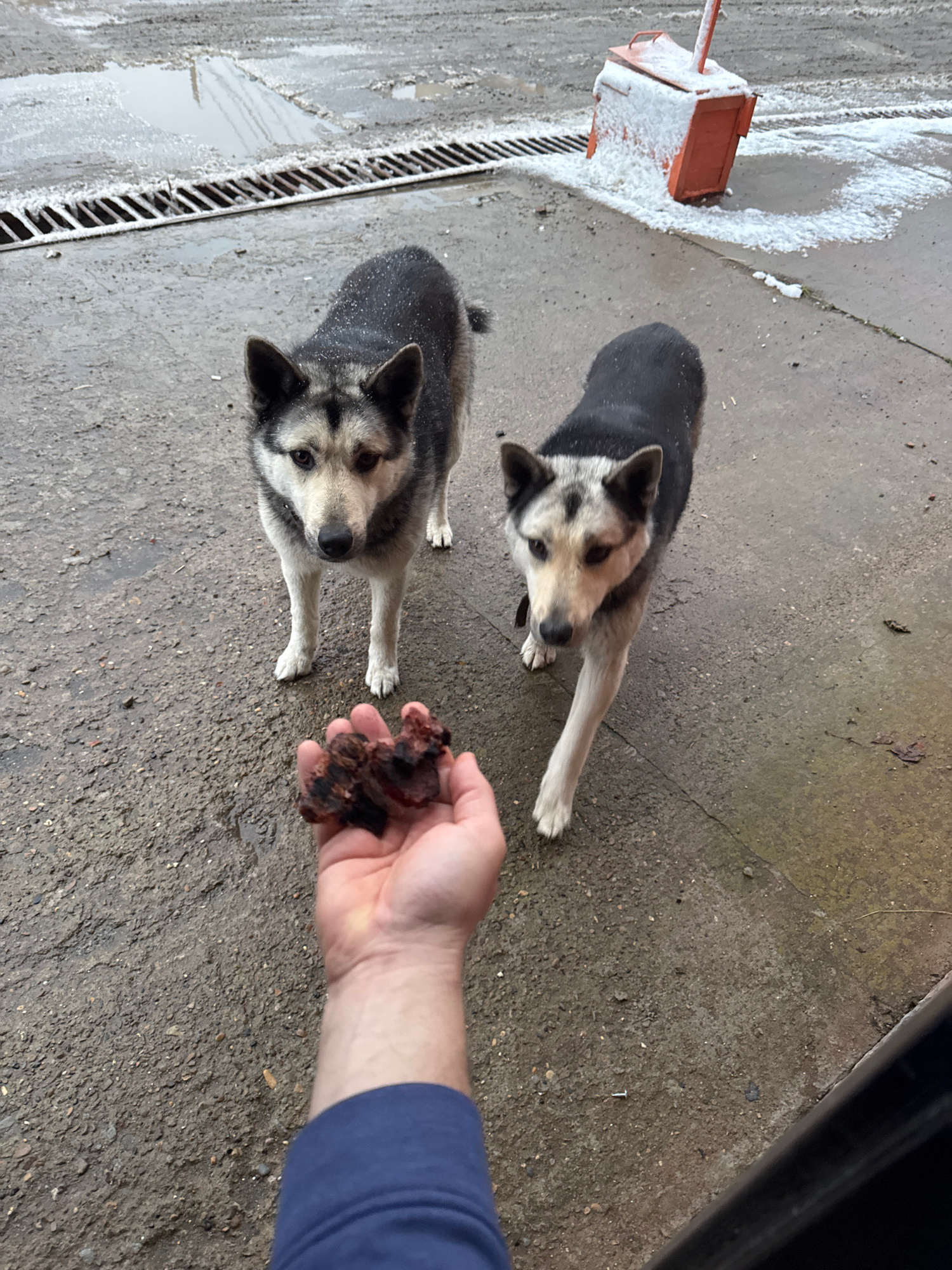 A high-angle, medium shot depicts two dogs on a concrete surface, with a human hand offering them food. The dogs are similar in appearance, with black and gray fur, white underbellies and paws, and tr…read more