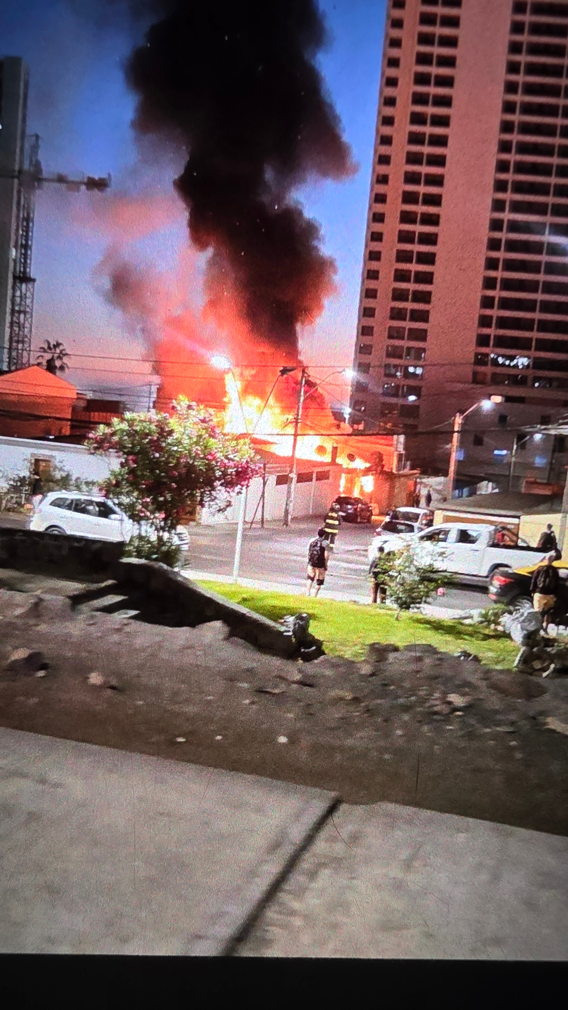 The image shows a fire in the city of Iquique, Chile. A large plume of black smoke rises to the left of a tall building. Firefighters are present on the street near the fire, which appears to be engulβ¦read more
