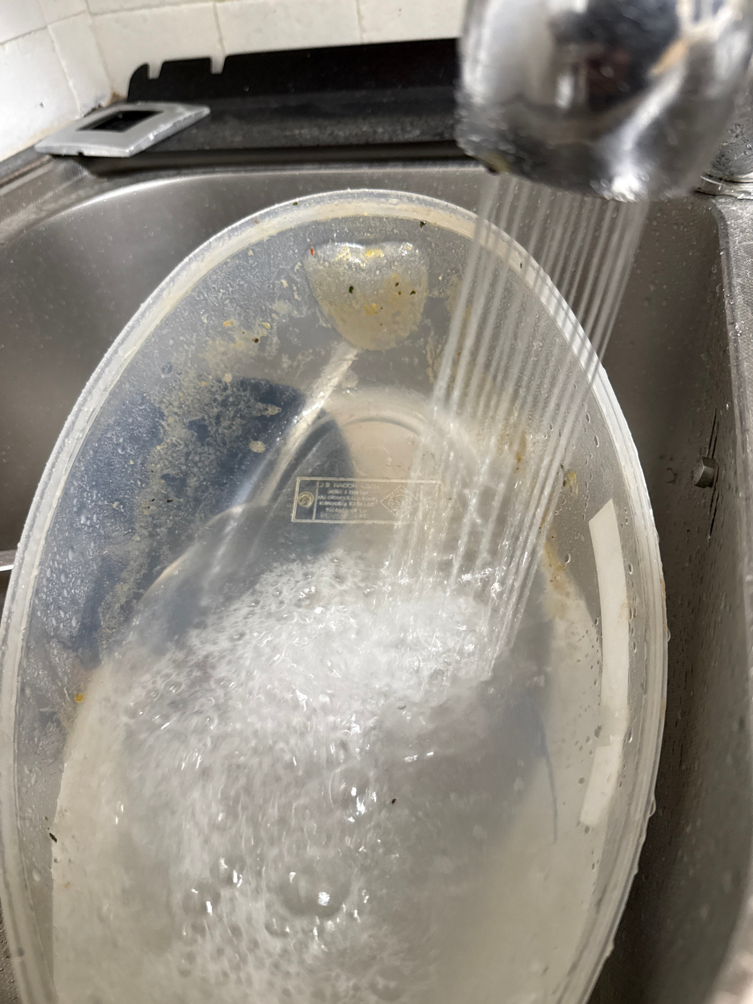 A dirty plastic container sits in a stainless-steel sink under a running faucet. The container has food residue and is being rinsed with water. The sink is partially visible. The faucet is chrome. The…read more