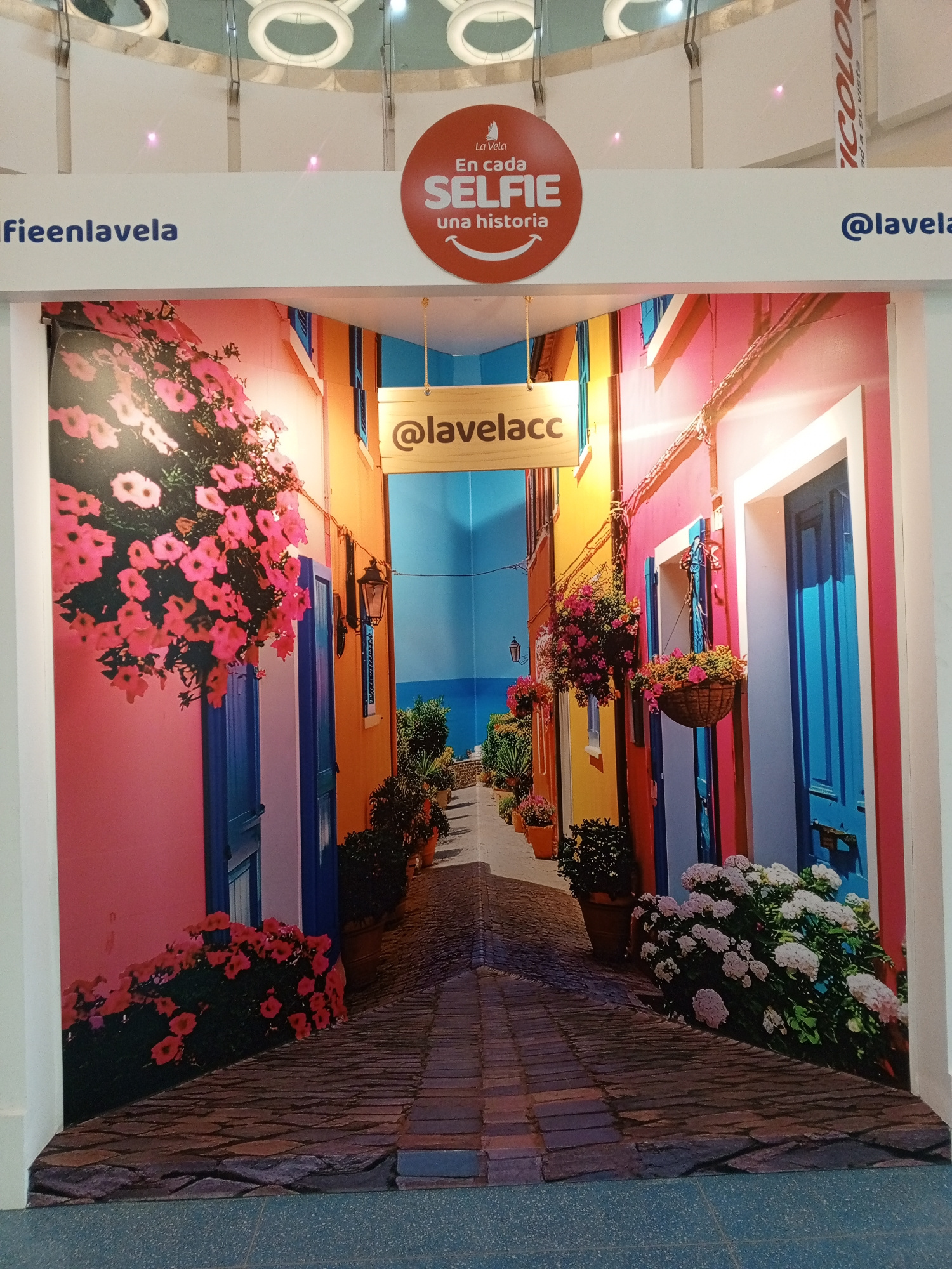 A vibrant, colorful photo booth is set up, likely within a commercial space, as indicated by the overhead lighting. The setup simulates a narrow European street with vivid hues of pink, orange, and bl…read more