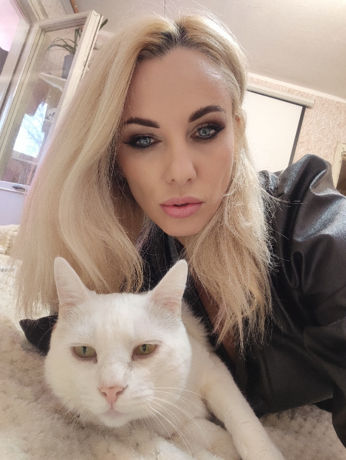 The scene depicts an indoor residential setting located in Sevastopol, Ukraine. An adult female and a domestic cat are positioned in the foreground, likely on a bed or soft furnishing. The female, sit…read more