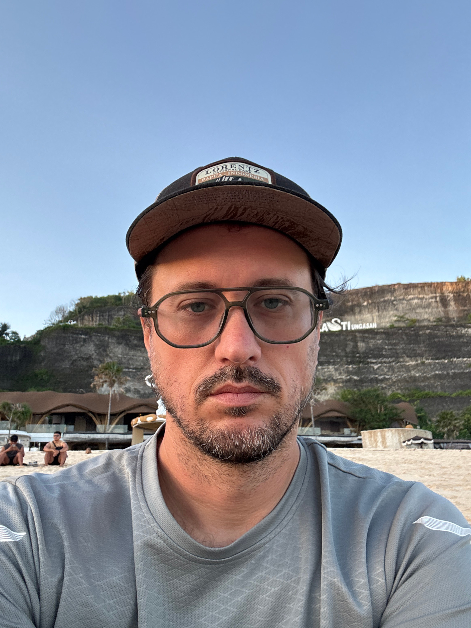 A selfie of a man with glasses and a baseball cap, facing the camera. The man is wearing a gray shirt. The background shows a cliff face with the words "KASTI UNGASAN" in large white letters, indicati…read more