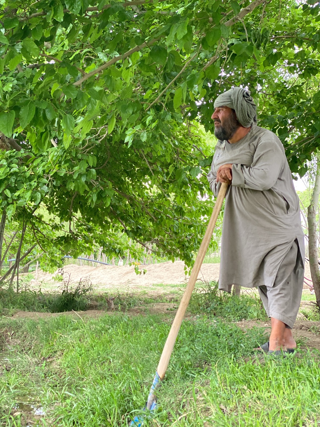 The image shows a man standing outdoors in Bazarcheh, Afghanistan. He wears traditional gray clothing and a turban. He leans on a hoe, the blue head of which is visible near the grass-covered ground.…read more