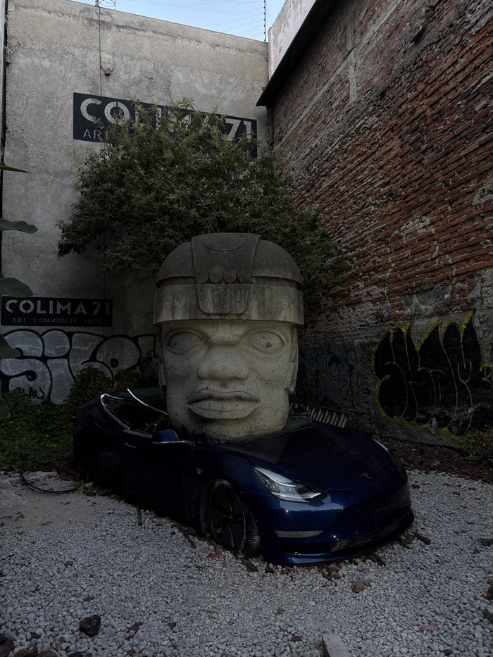 A blue car parks next to a stone Olmec head sculpture with overgrown greenery. The backdrop features a building with "COLIMA 71 ART COMMUNITY HOPE" graffiti and a brick wall with other graffiti. The g…read more