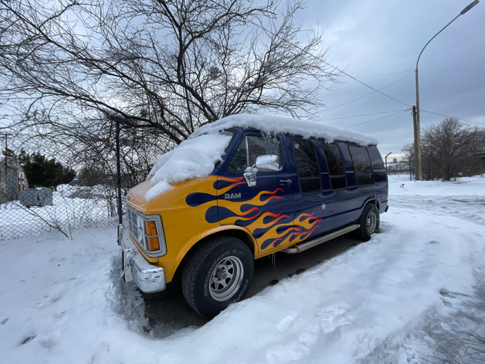 A customized Dodge Ram van is parked outdoors in a snow-covered environment, likely a suburban or semi-industrial area of Belgrade, Serbia, under an overcast sky. The van features a yellow hood and fr…read more
