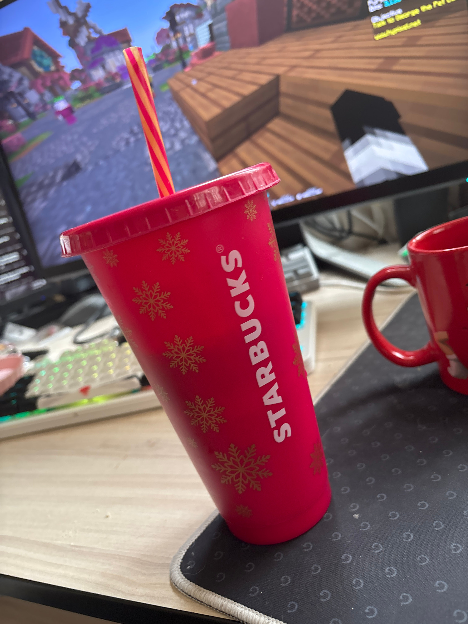 The image shows a desk with a black patterned mousepad on which rests a red Starbucks tumbler with golden snowflake designs. The tumbler has a red and yellow striped straw sticking out of it. Next to…read more