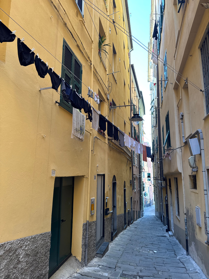 This image depicts a narrow alleyway in the historic city center of Genoa, Italy, characterized by tall, aged buildings. The perspective looks down the alley, which recedes into the distance, framed b…read more