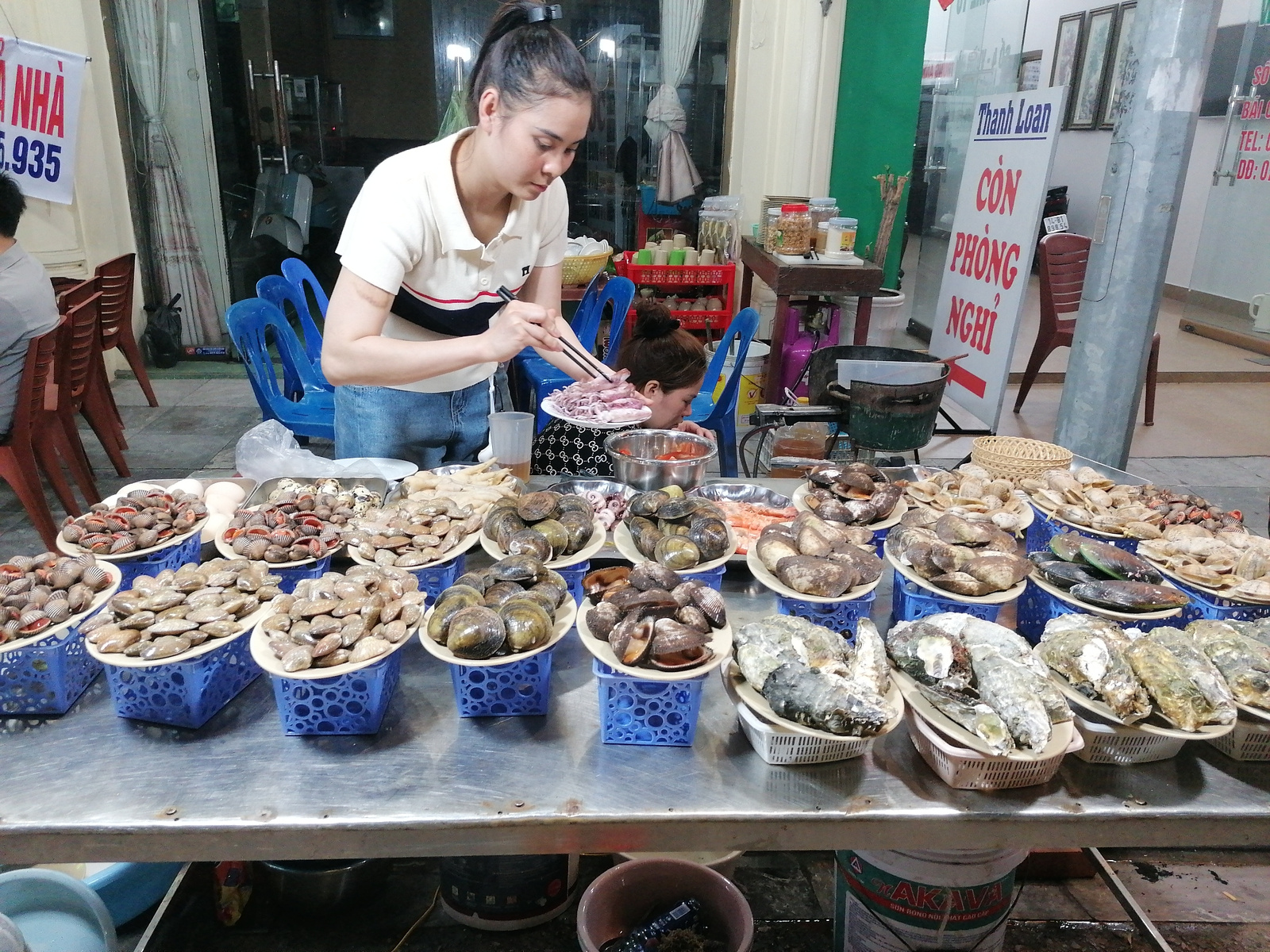 This media file captures an active seafood stall or restaurant at night, likely in Bai Chay Ward, Vietnam, given the provided context and visible text. The scene is illuminated by artificial lights, c…read more