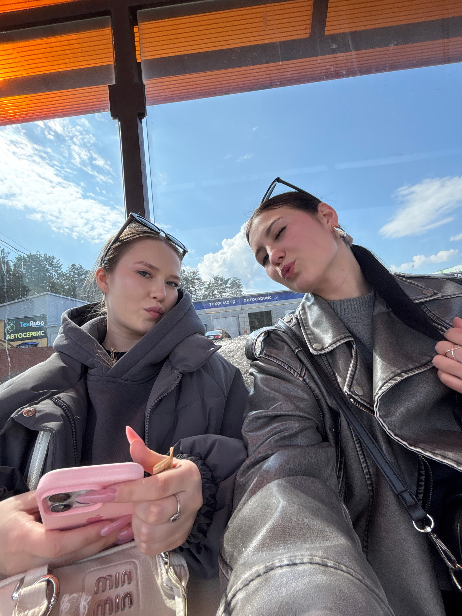 Two young women are captured in a selfie-style photograph, seemingly taken through a large window, possibly from a vehicle or building. Both are looking directly at the camera with a playful "duck fac…read more