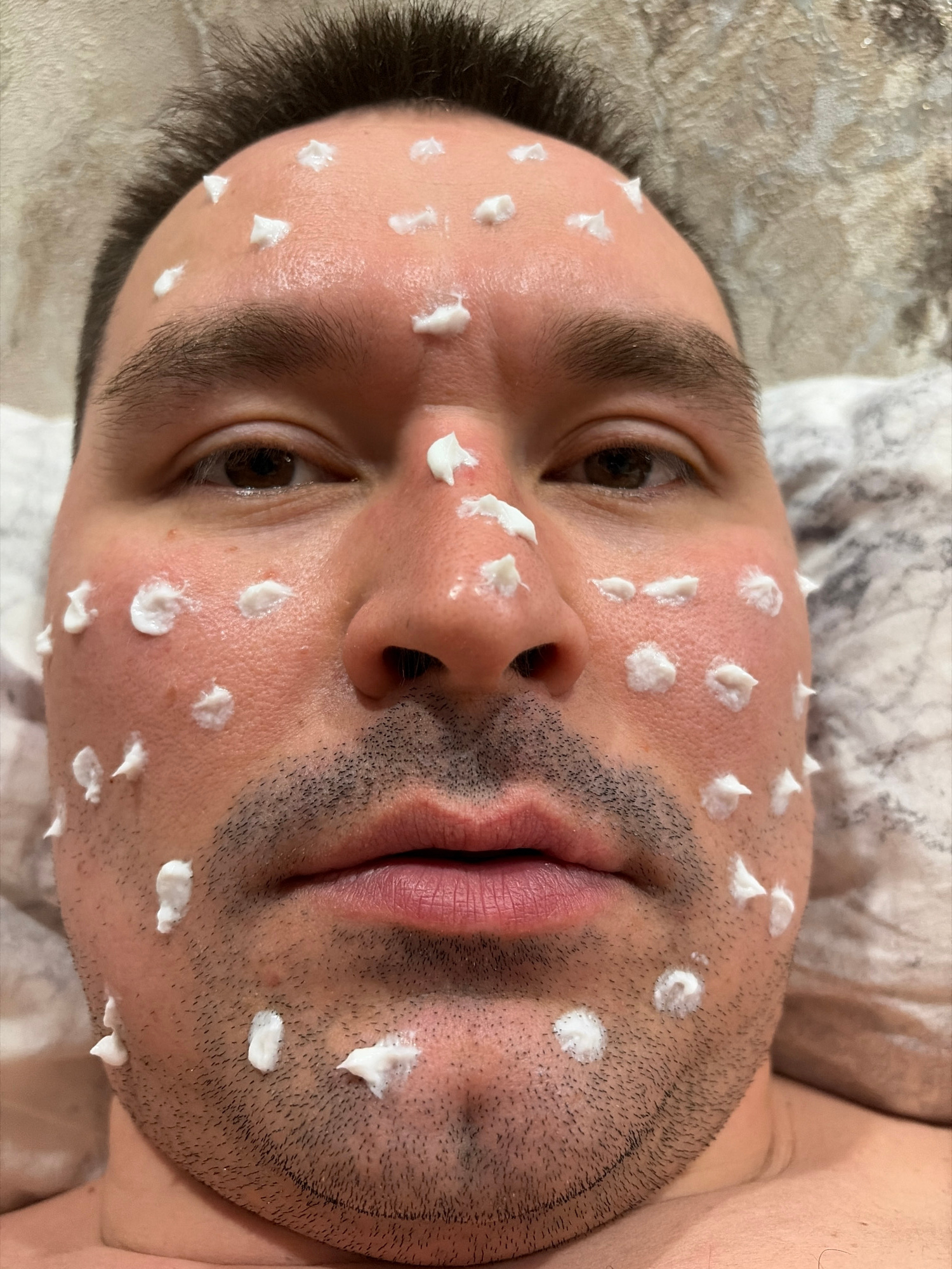 A close-up, angled view shows a man lying down with white cream spots applied to his face. His face occupies the majority of the frame. He has dark hair, brown eyes, and stubble. The background consis…read more
