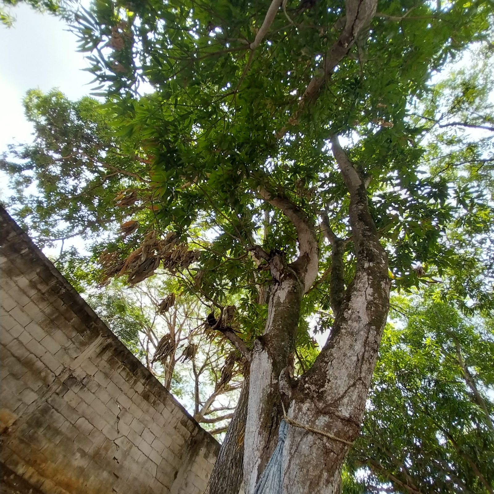 A low-angle shot shows a tree with dense green foliage above a wall. A thick, curving tree branch, partially covered in lichen or moss, extends across the middle of the frame. A rope or string is visi…read more