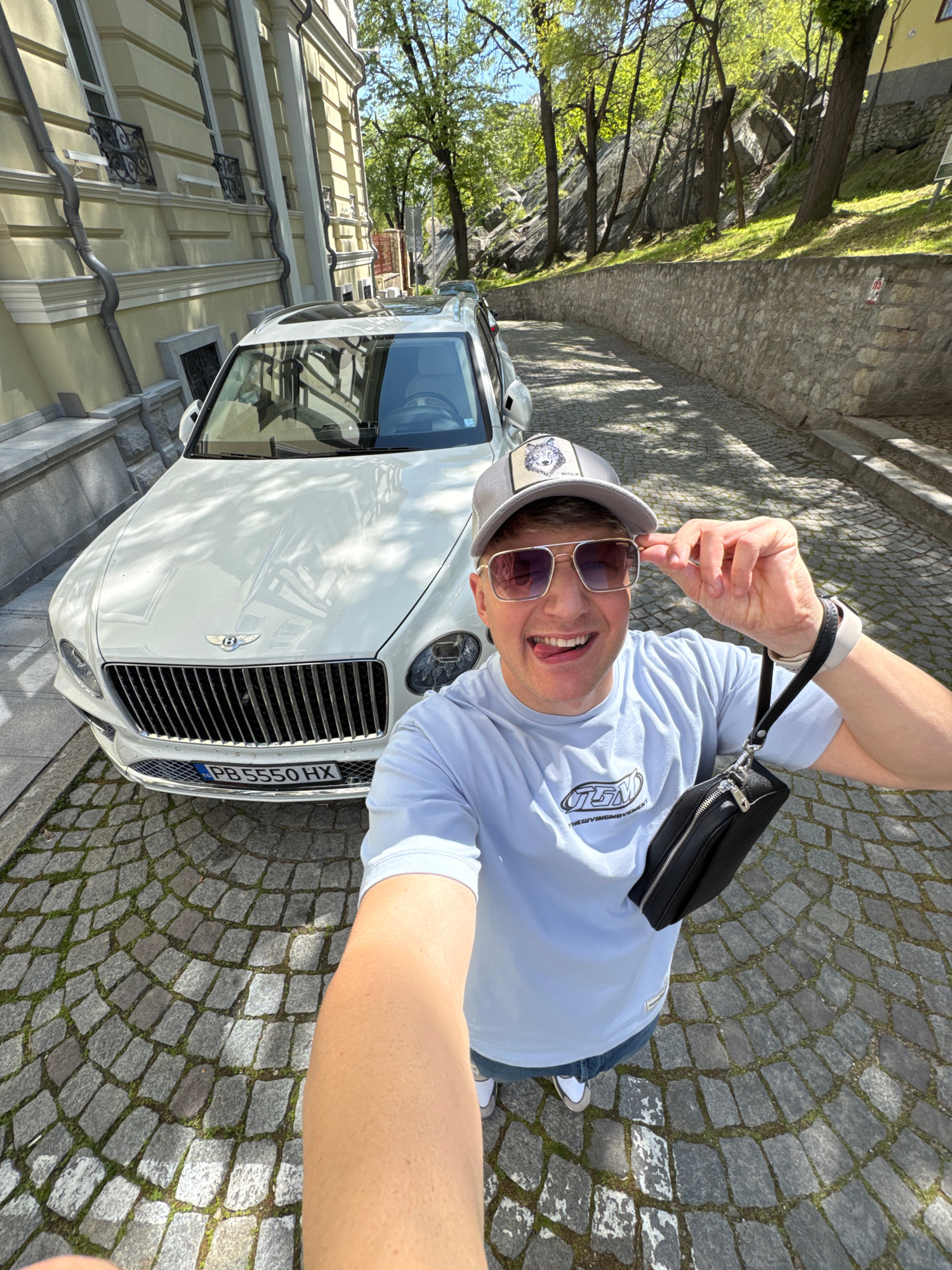 A man is posing for a selfie standing in front of a white Bentley car on a cobblestone street. The man wears a light blue t-shirt, blue jeans, white sneakers, sunglasses, and a gray cap with a wolf em…read more