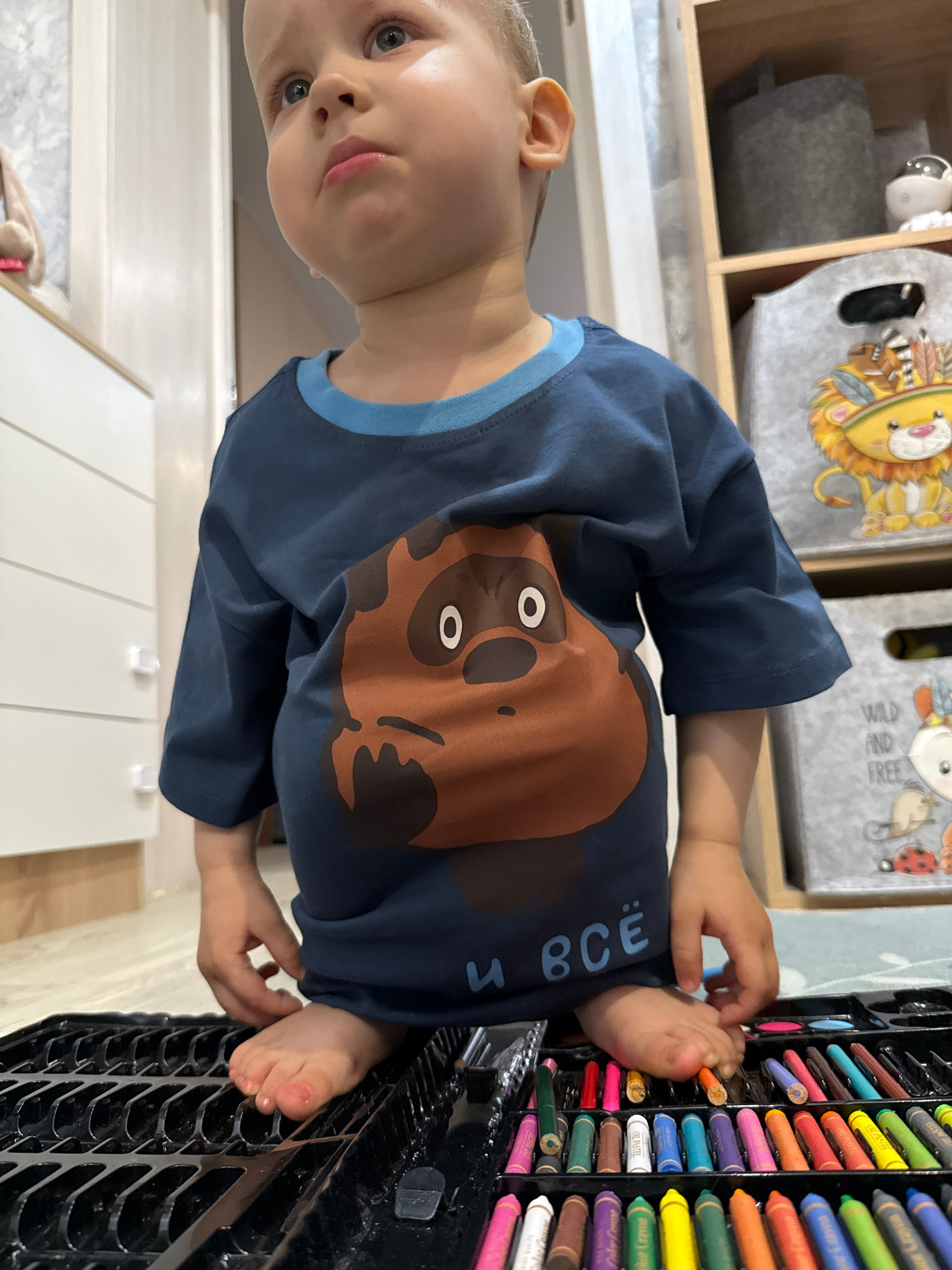 A young child with light skin and hair is depicted in an indoor setting, possibly a home in Rusanovo, Russia. The child is wearing a navy-blue long-sleeved shirt with a cartoon bear print. The child'sā¦read more