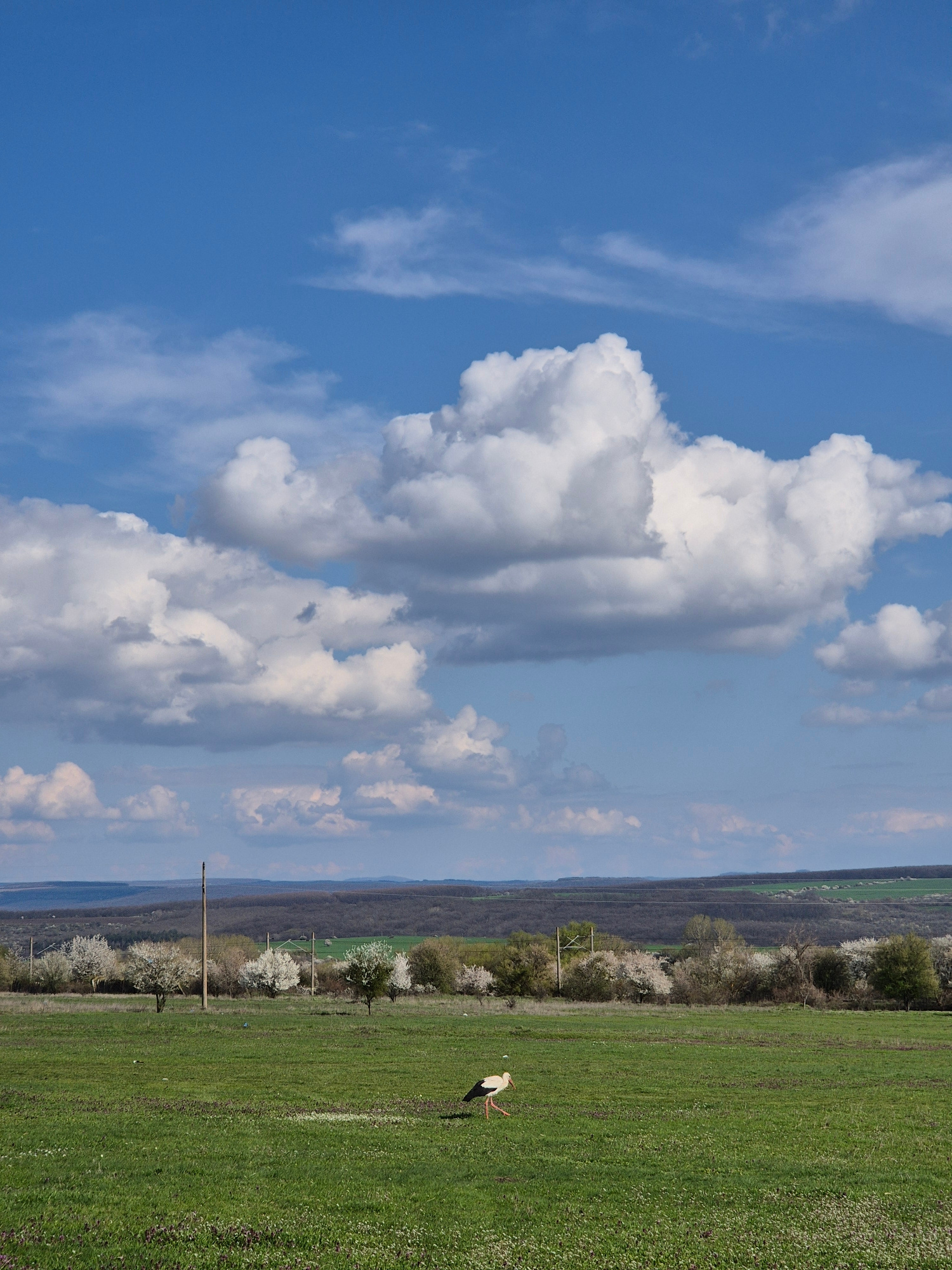 A horizontal outdoor shot displays a sky with patchy white clouds on the left, transitioning to a landscape with green grass and trees on the right, potentially located near Медовина, Bulgaria. A sing…read more