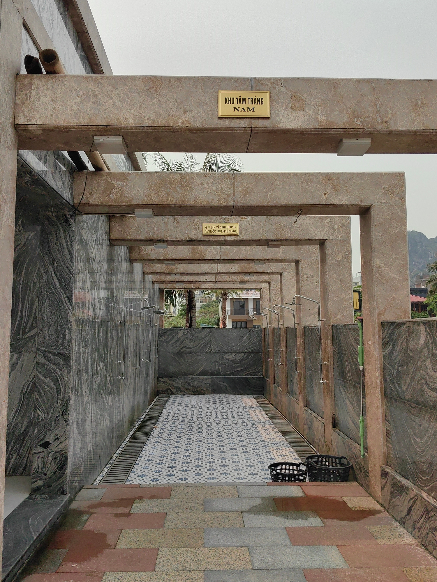 This image captures an empty outdoor communal shower facility located in Ha Long Ward, Vietnam. The structure consists of sturdy, light-brown marble or granite beams and columns, forming a repeating,…read more