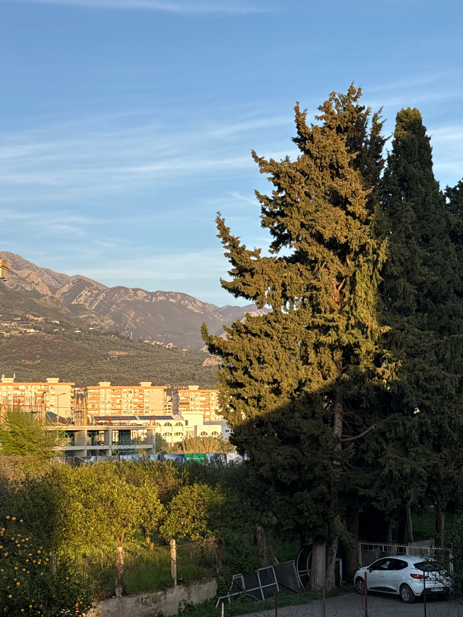 The image captures a scene in Bar, Montenegro, featuring a mountainous landscape and urban development. Dominating the foreground is a large, mature evergreen tree, its branches reaching towards a cle…read more