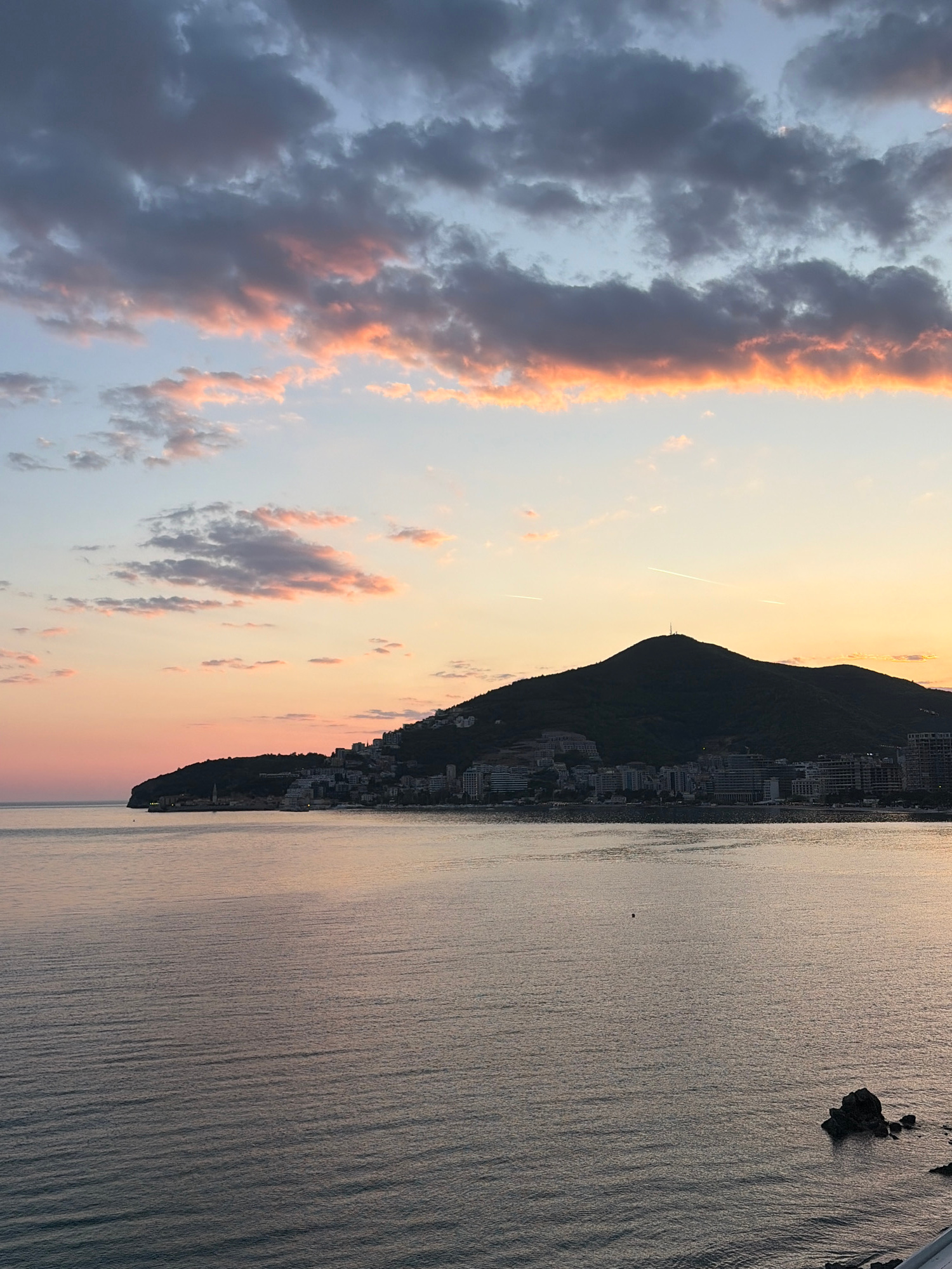 The image captures a scenic view in Budva, Montenegro, at what appears to be sunset or sunrise. The left side of the image shows a sky filled with clouds, some edged with a warm, pinkish-orange light.…read more