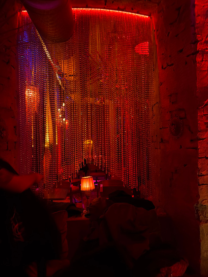 The image depicts an interior scene within The Kond House bar, located at 4 Pushkin Street in Yerevan, Armenia. The environment is characterized by rough, exposed stone or brick walls, heavily illumin…read more