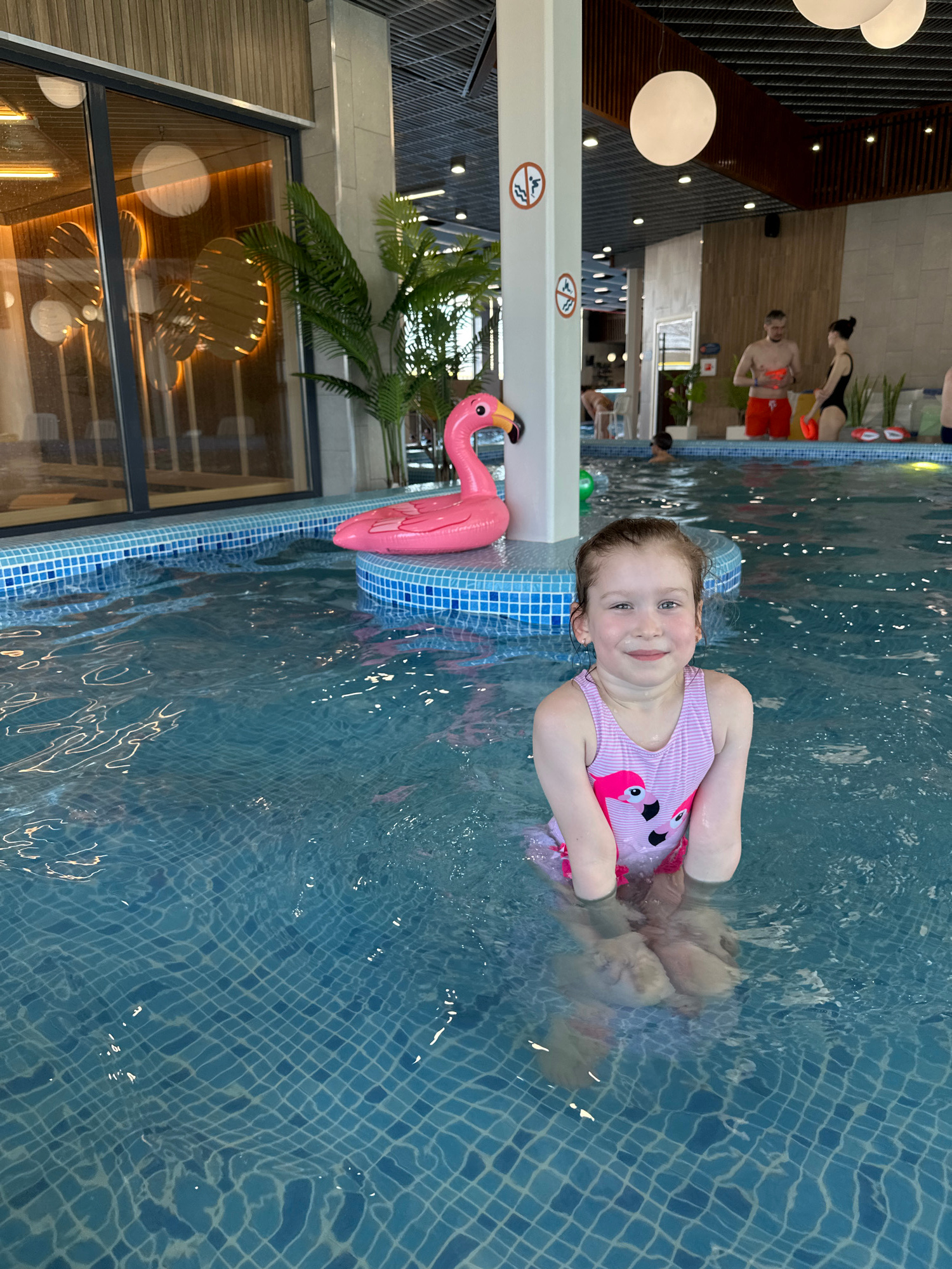 A young girl in a pink flamingo swimsuit is sitting in a pool. The pool has light blue tiles and water. There is a pink flamingo float next to her. Behind her, there are other people in the pool and l…read more