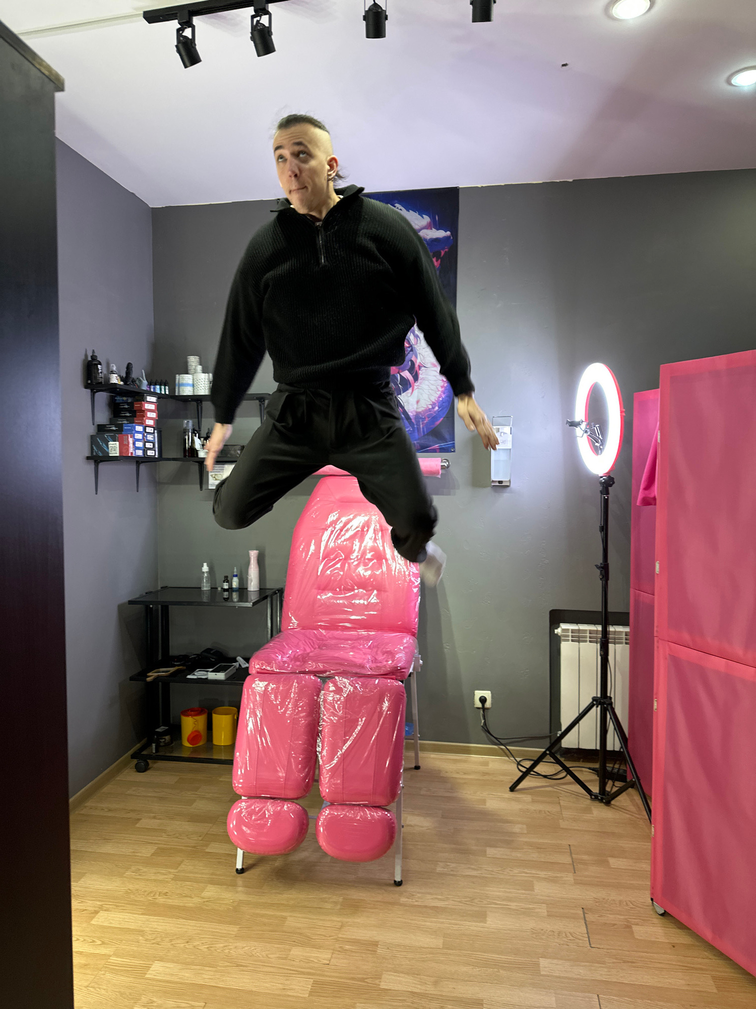 The image portrays an indoor scene within a commercial establishment, specifically identified as being in Saratov, Russia. The room features medium-grey walls and a light-colored wooden plank floor, with a white ceiling equipped with black track lighting and recessed circular lights. A male individual, dressed in a black long-sleeved sweater with a zipped collar and black trousers, is prominently positioned in the center, captured mid-jump. His legs are bent, and arms are slightly extended, with an open-mouthed expression directed upwards and to the right. He has a distinctive hairstyle with shaved sides and longer hair styled back on top. The primary object in the foreground is a bright pink, adjustable studio chair or bed, fully enveloped in crinkled, translucent pink plastic sheeting. To the left of the frame, a black wall-mounted shelving unit displays various bottles, boxed items, and rolls of material. Below it, a black two-tiered mobile cart holds additional bottles and a pink vase on its upper shelf, and two yellow cylindrical containers on its lower shelf. A colorful, abstract art piece featuring purple and blue tones is partially visible on the left wall, behind the jumping individual. On the right side of the image, an illuminated LED ring light stands on a black tripod, with a mobile phone holder attached to its center. To the left of the ring light, a clear, wall-mounted hand sanitizer dispenser is visible. Below the ring light, a white radiator is affixed to the wall, with a white electrical outlet and black plug situated nearby. On the far right, a structure composed of bright pink panels, likely a cabinet or partition, is present, with a pink towel draped over one section. A small, dark object is visible on the white ceiling above the right side of the room. | Open Wire