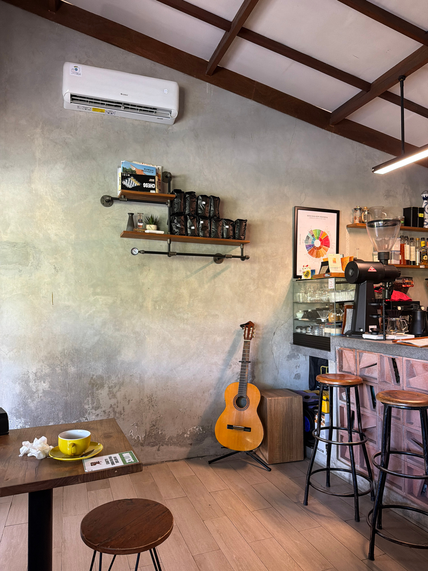 The image captures an interior view of a building in Kerobokan Kelod, Indonesia. The architectural features include a white air conditioning unit, a wooden truss ceiling, and concrete flooring with a…read more