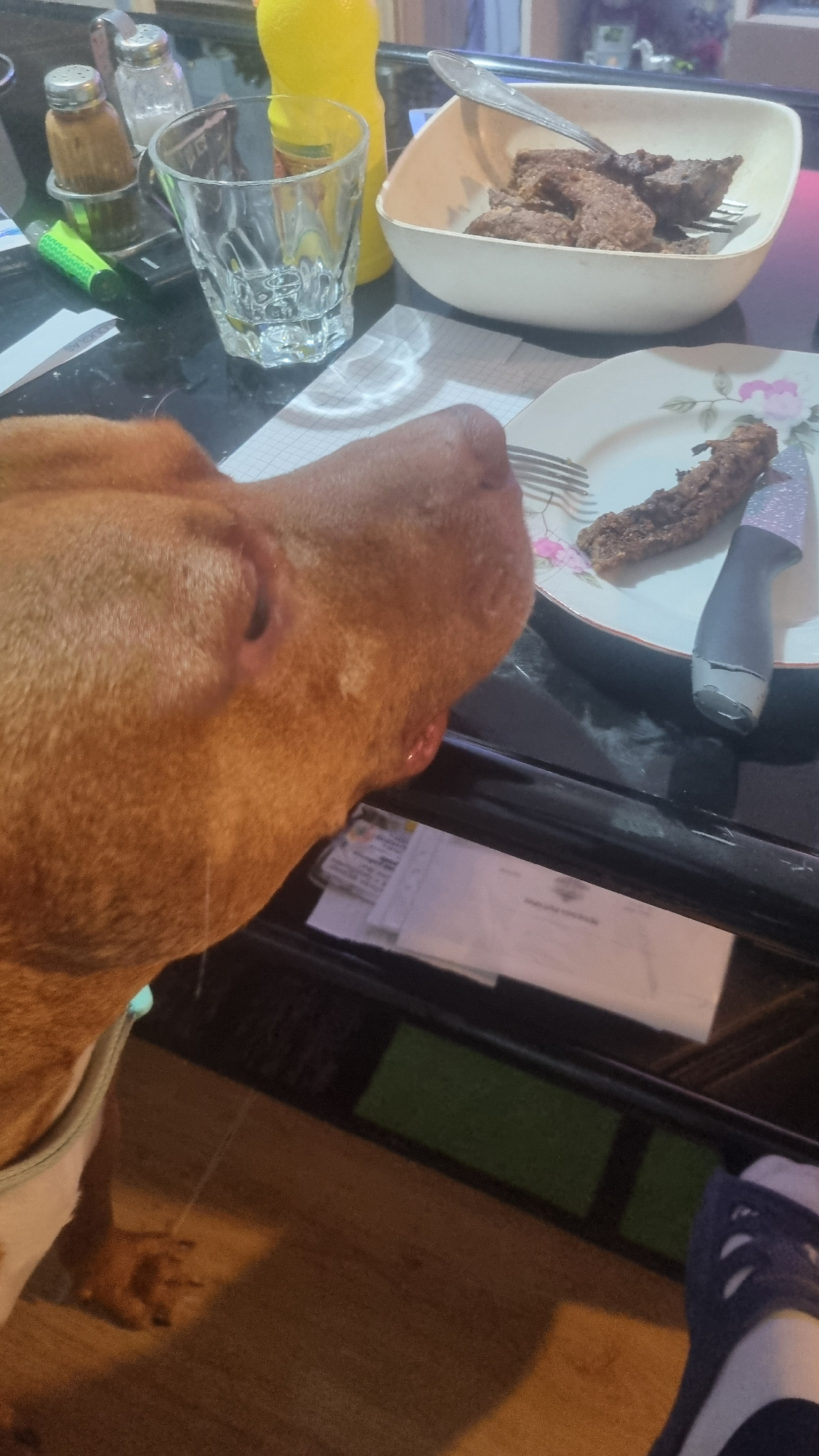 A close-up, slightly tilted, eye-level shot shows a table surface crowded with various items, most notably food and dining implements, along with the head and part of the body of a light brown dog. Th…read more