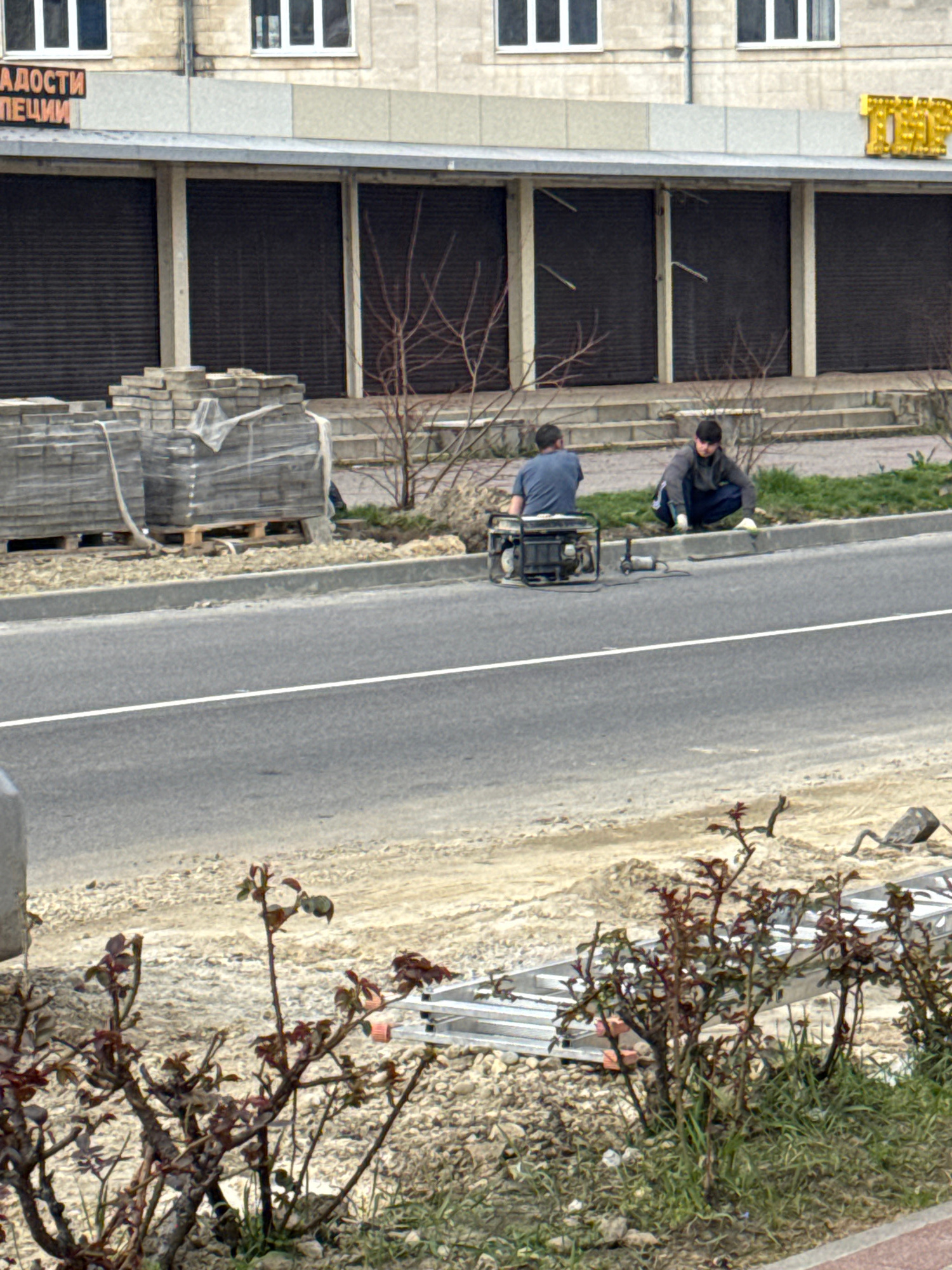 This image depicts a street scene in an urban area of Anapa, Russia, during daytime under overcast conditions. Two individuals are engaged in construction or renovation work alongside a paved road. I…read more