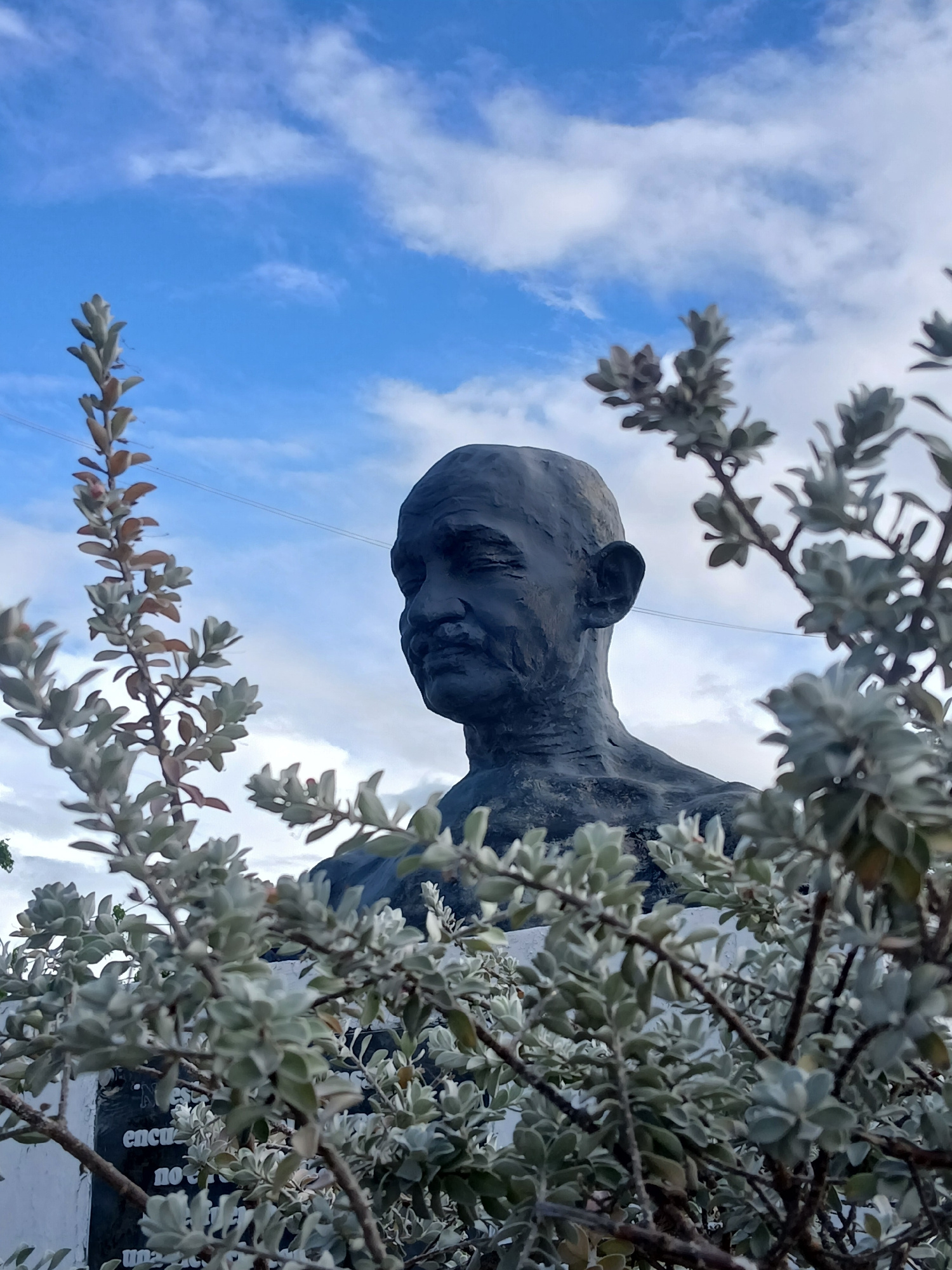 A dark, weathered bust sculpture of a man, likely Mahatma Gandhi, is positioned outdoors under a partially cloudy blue sky. The sculpture, depicting the subject from the chest up, features a head turn…read more