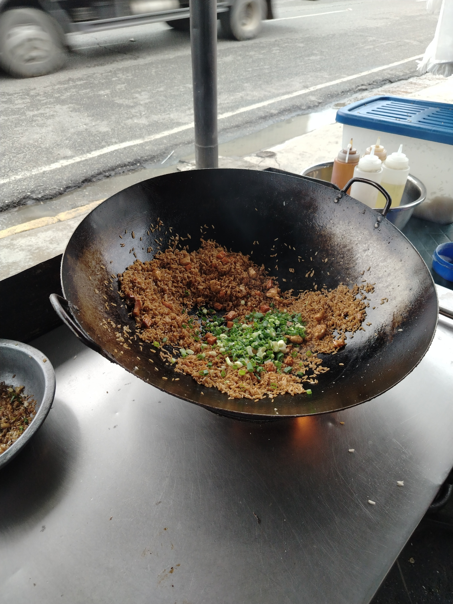 This image captures an outdoor street food scene, likely a vendor preparing fried rice, with a bustling road in the background. The central object is a large, well-used black wok, filled with brownish…read more