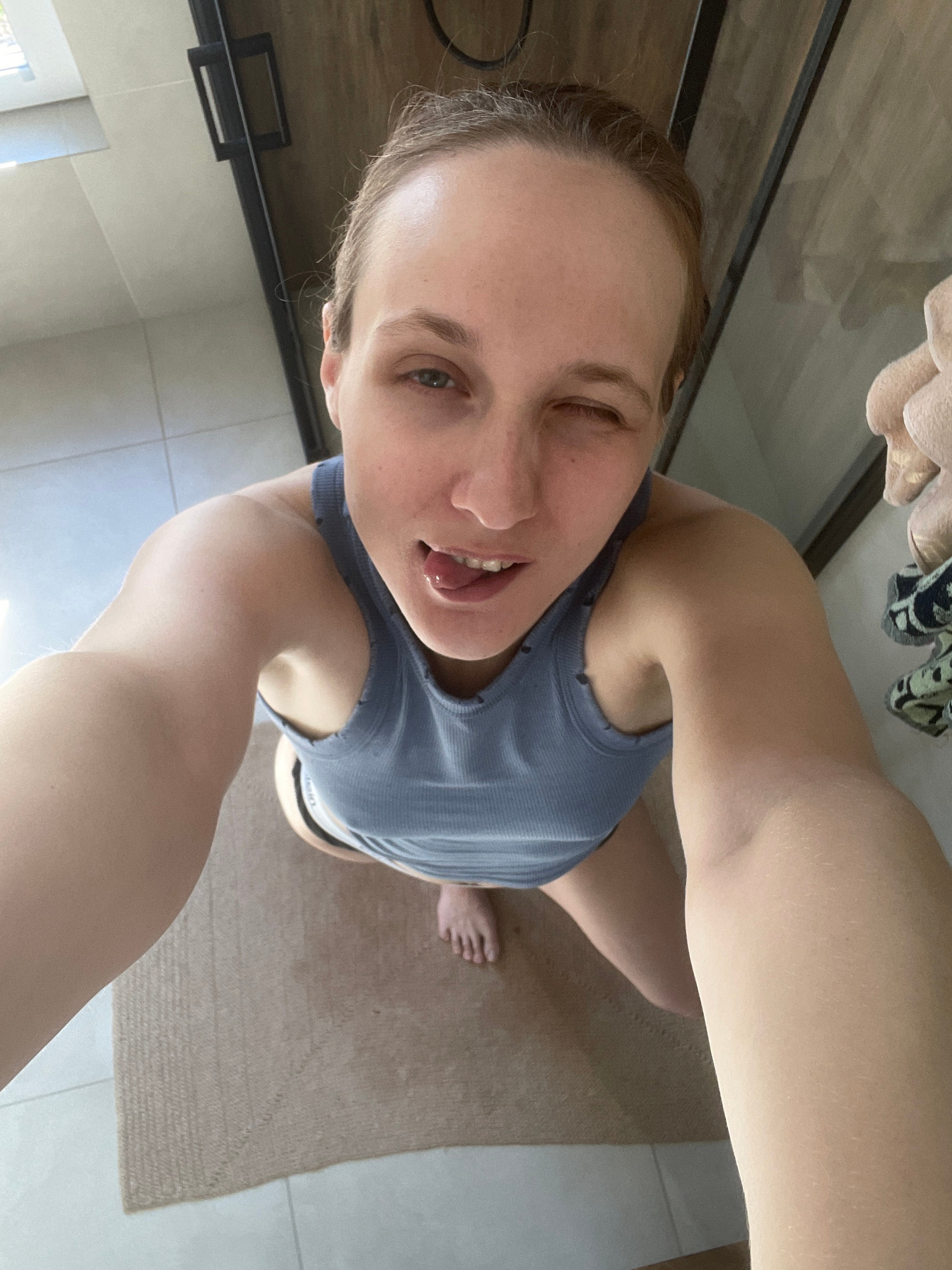 A woman is taking a selfie in what appears to be a bathroom. The woman has light skin, with brown hair pulled back. She is wearing a gray tank top. The bathroom has beige tiles and a brown rug. A show…read more