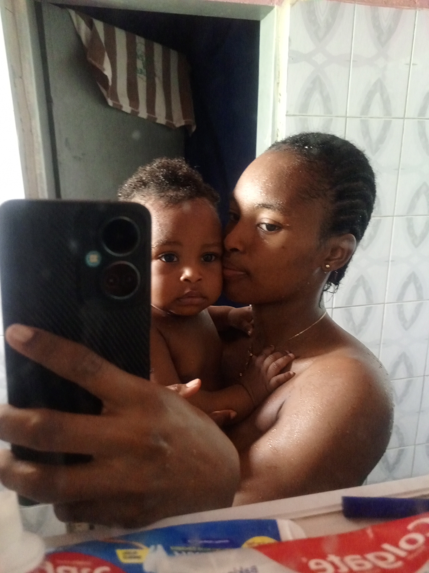 A woman is holding a baby while taking a selfie in what appears to be a bathroom. The woman has her hair styled in short braids, a gold necklace, and an earring. She appears to be damp. The baby looks…read more