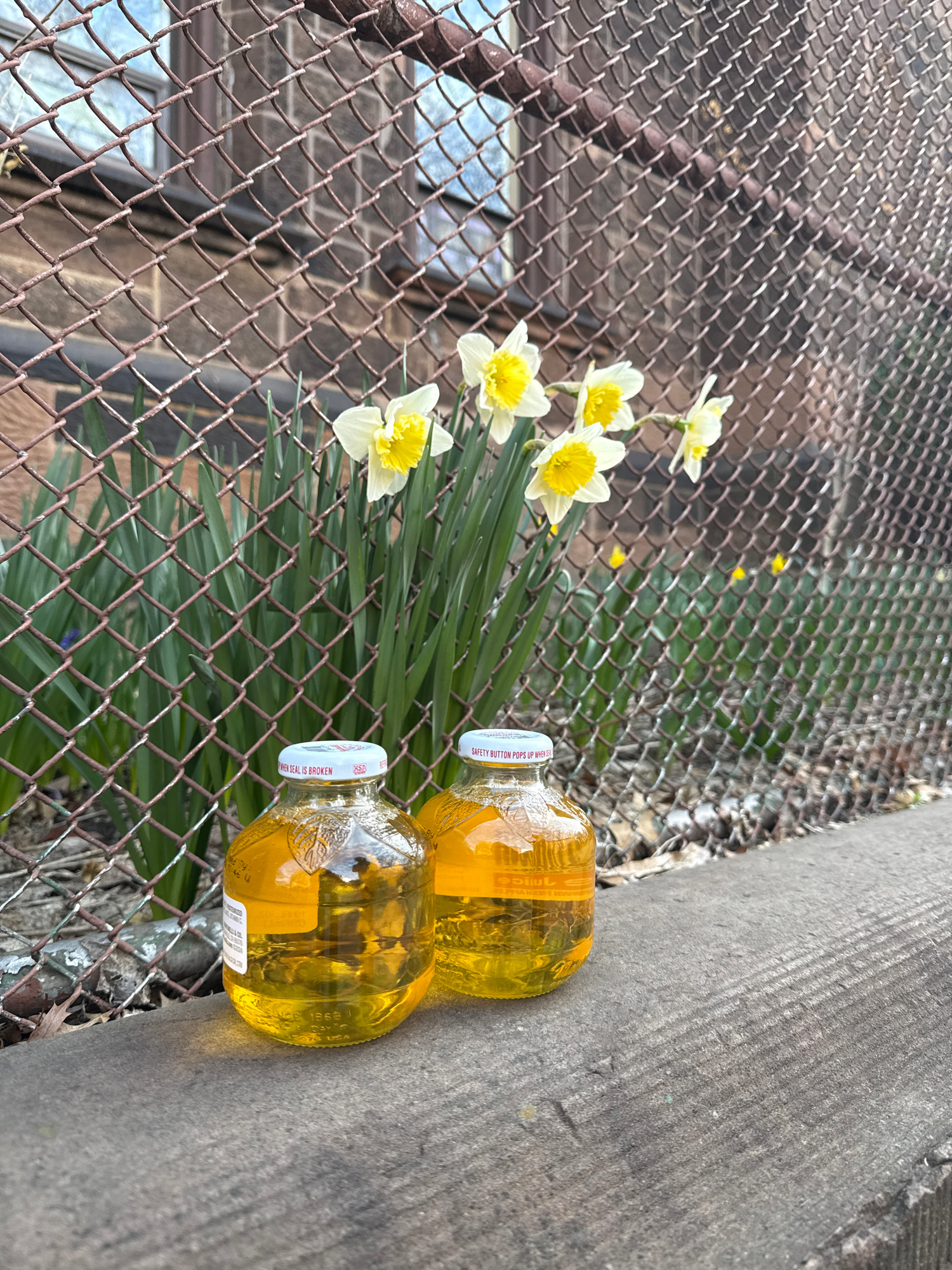 This outdoor scene in New York City features a cluster of daffodils with white petals and yellow centers, arranged against a backdrop of a brown chain-link fence. A narrow patch of concrete is visible…read more