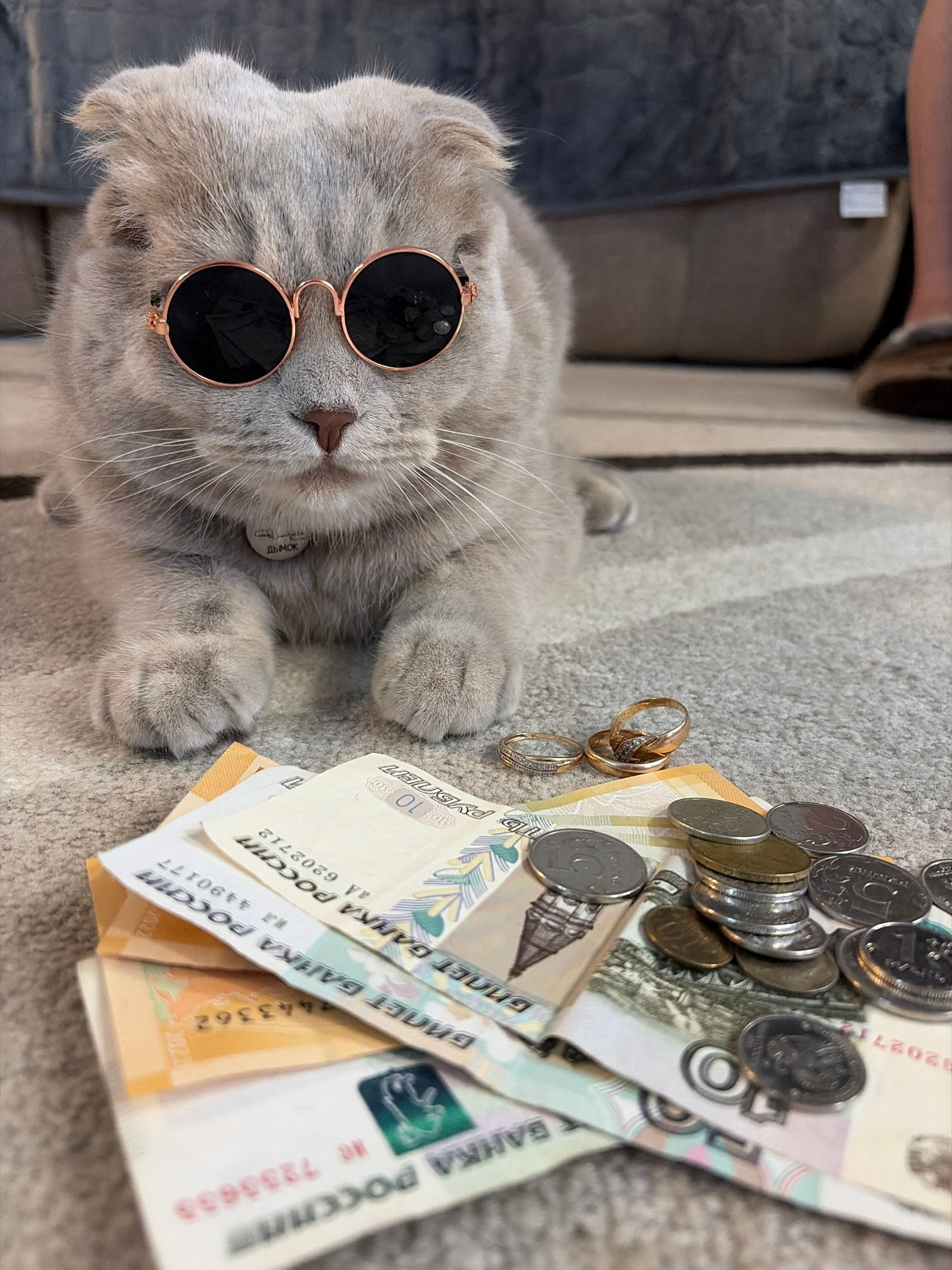 The image shows a light-gray Scottish Fold cat wearing round, rose-gold sunglasses, lying on its side on a gray textured carpet. The cat wears a small, round tag around its neck with the Russian word…read more